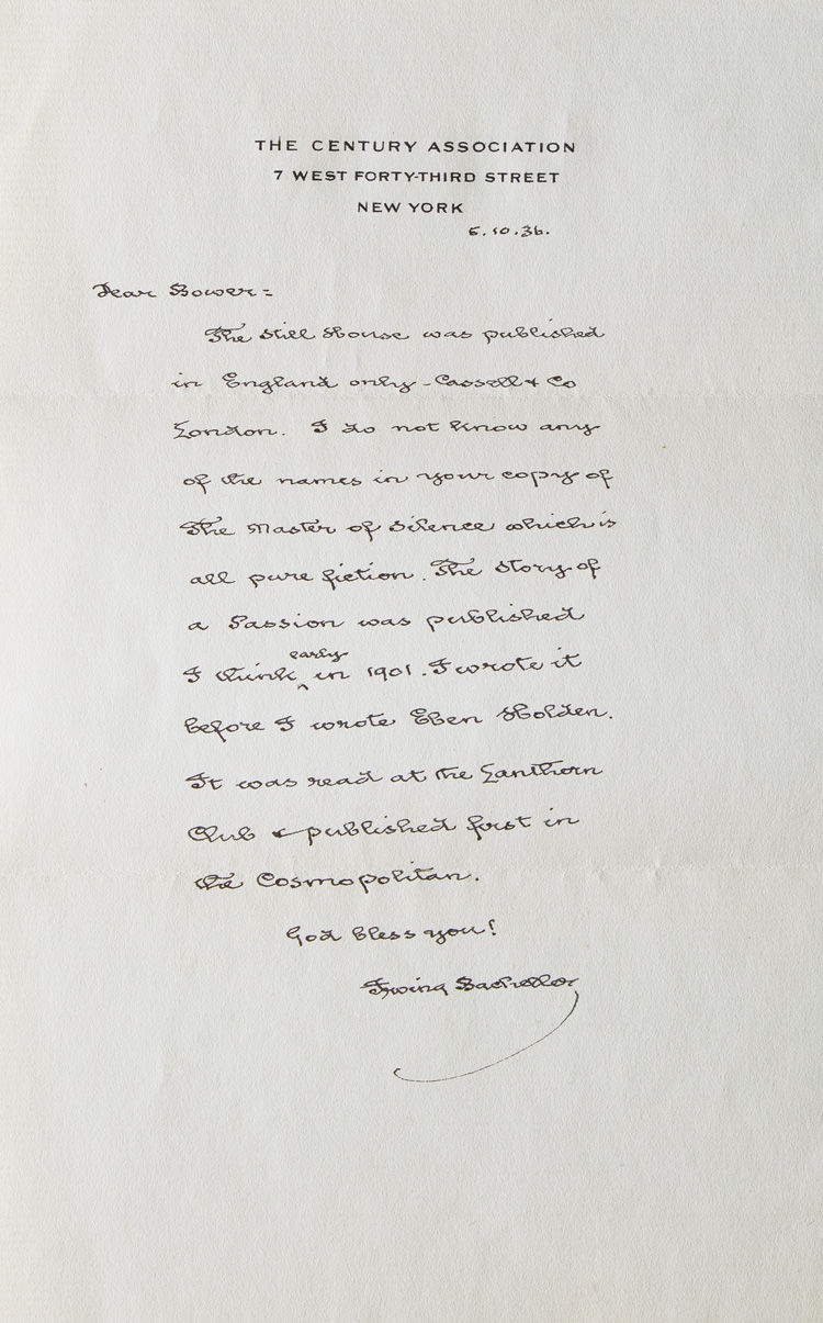 Nice copy of a classic tale, with an autograph letter, signed, on Century Association letterhead, dated 10 May 1934, to William J. Bower, discussing the publication history of several early works, including his first book The Master of Silence (1892); and Bower’s retained carbon. Wetzel p. 99