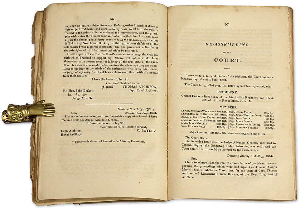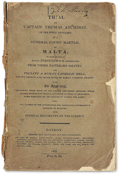 1825. London: Printed for Hatchard and Son, 1825.. London: Printed for Hatchard and Son, 1825. A Trial Concerning the Status of Catholics in Early Nineteenth-Century Britain [Trial]. Atchison, Thomas, Defendant and Compiler. Trial of Captain Thomas Atchison, Of the Royal Artillery, By a General Court Martial, At Malta; In Consequence of Having to be Exonerated from Firing Patteraro Salutes, And Tolling a Roman Catholic Bell, For the Church and Image Rites of Roman Catholic Priests. With an Appendix, Describing Those Rites of the Romish and Greek Churches which British Protestant Troops, Infantry as Well as Artillery, Were Required by the Priests to Attend and Assist; Also, The Nature of the Attendance and Assistance Consequently Ordered to be Given. With Official Documents on the Subject. London: Printed for Hatchard and Son, 1825. viii, 91 pp. Octavo (8-3/4" x 5-3/4"). Disbound stab-stitched pamphlet, untrimmed edges, front wrapper retained. Moderate edgewear and soiling, front wrapper detached and worn, "12" and owner signature in early hand at head, moderate toning to text, faint dampstaining to heads of a few leaves above text, "From the Author" in contemporary had to verso of half-title. $500. * Only edition. Atchison was accused of imposing Catholic practices on the soldiers under his command. Found guilty by a court-martial, he was dismissed from the army. Atchison compiled this pamphlet to show he was the victim of anti-Catholic prejudice. OCLC locates 4 copies in North American law libraries (Harvard, Library of Congress, Stanford, York). Catalogue of the Library of the Harvard Law School (1909) II: 1006.