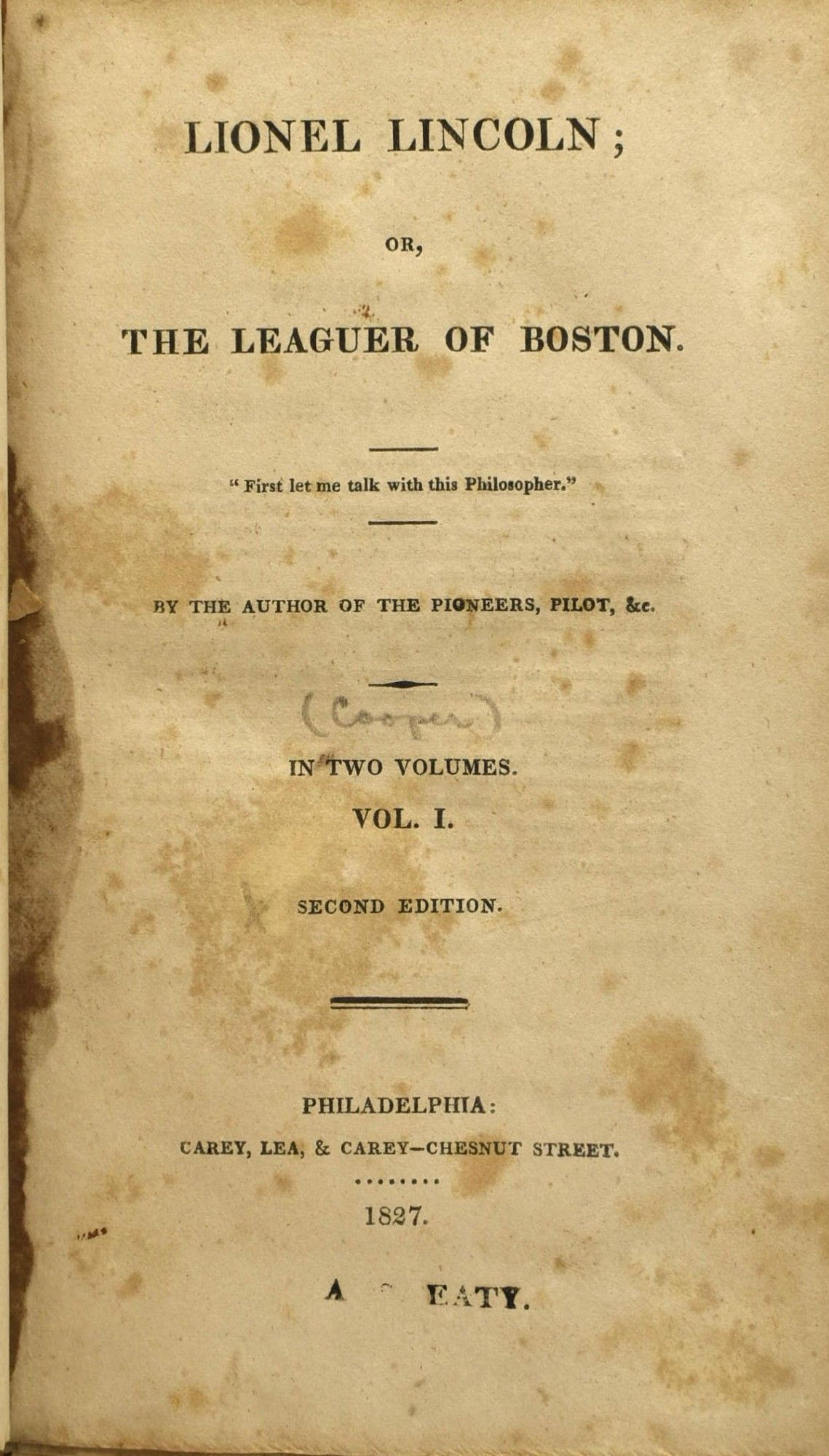 LIONEL LINCOLN; OR, THE LEAGUER OF BOSTON. VOL. I & II. (TWO VOLUMES)