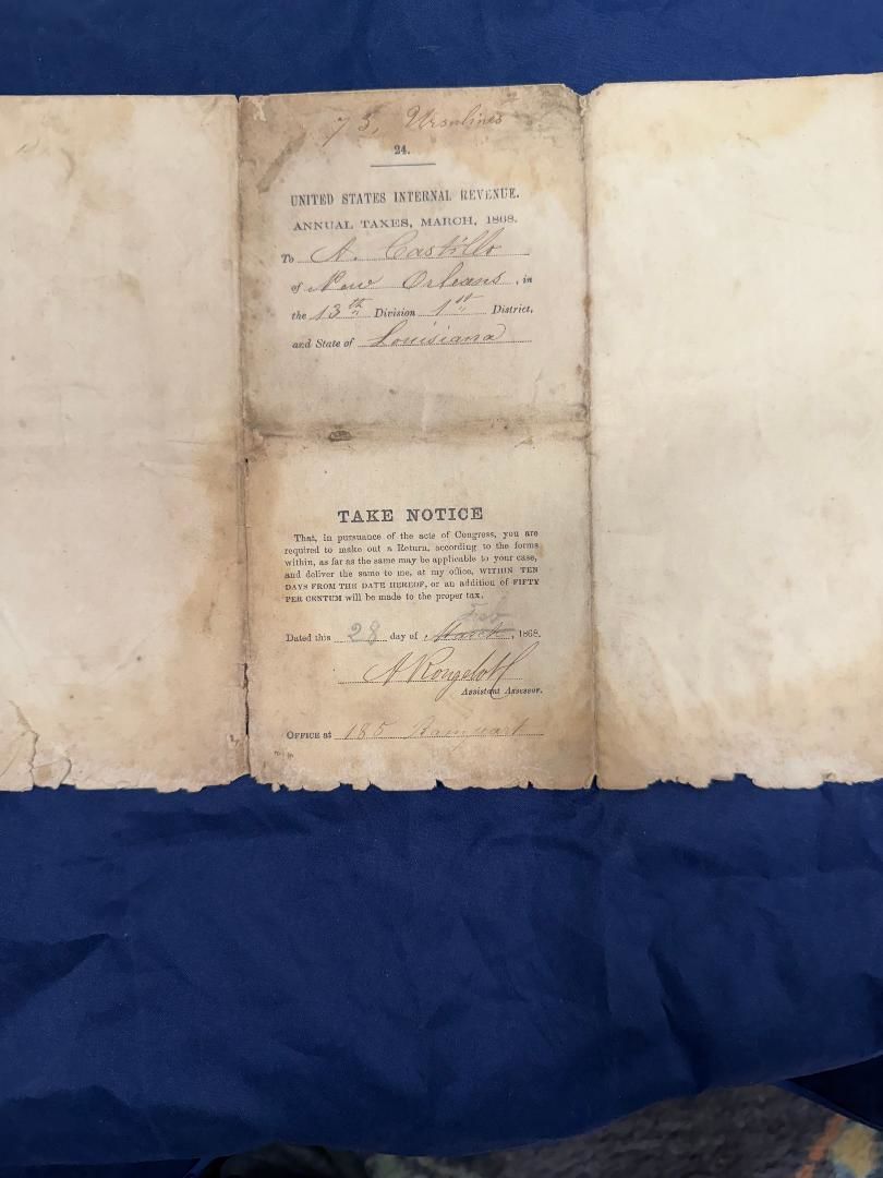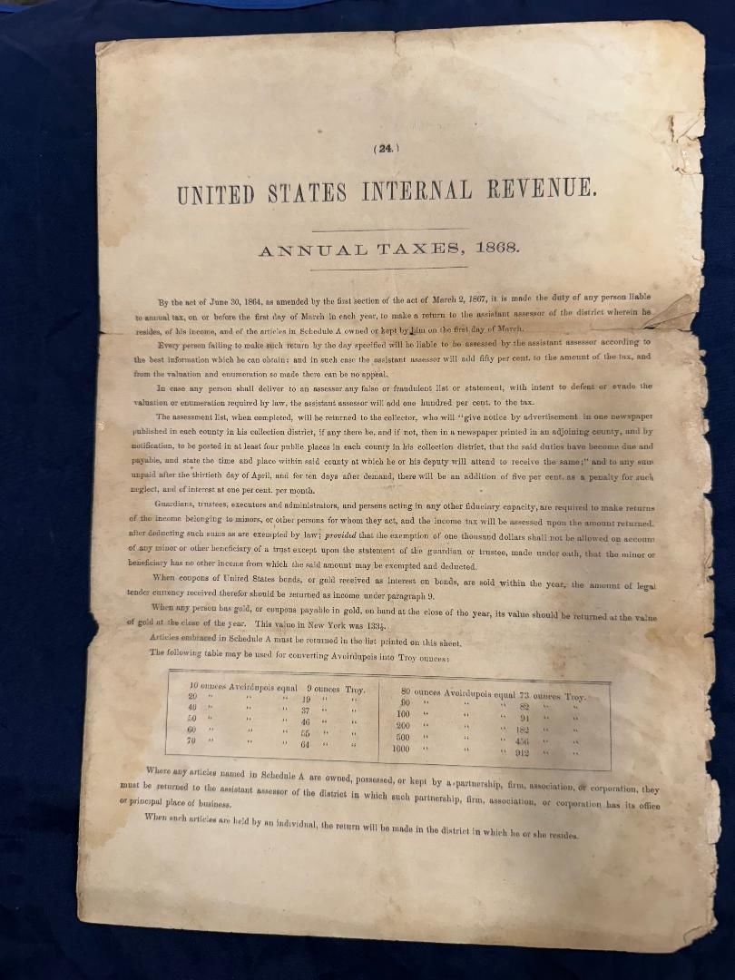 Printed form. 4 pages, a single folded folio sheet (11½x7¾"). Some darkening, soiling and light staining, some chips and tears along edges, wear at folds with a few small holed, edge wear; good. An early United States income tax form - the first personal income tax was instituted in 1861, at the beginning of the Civil War. However, the income tax would be repealed in 1872, but unfortunately the 16th Amendment made it a permanent part of our lives in 1913. Space is given for listing salary, rental income, dividends, profits from sale of gold, etc., and losses from it. There is a standard $1,000 personal deduction, "Exempt by law." While the form clearly states the penalties invoked by failure to pay, the recipient of the form evidently chose to risk the consequences, and did not fill out the form.