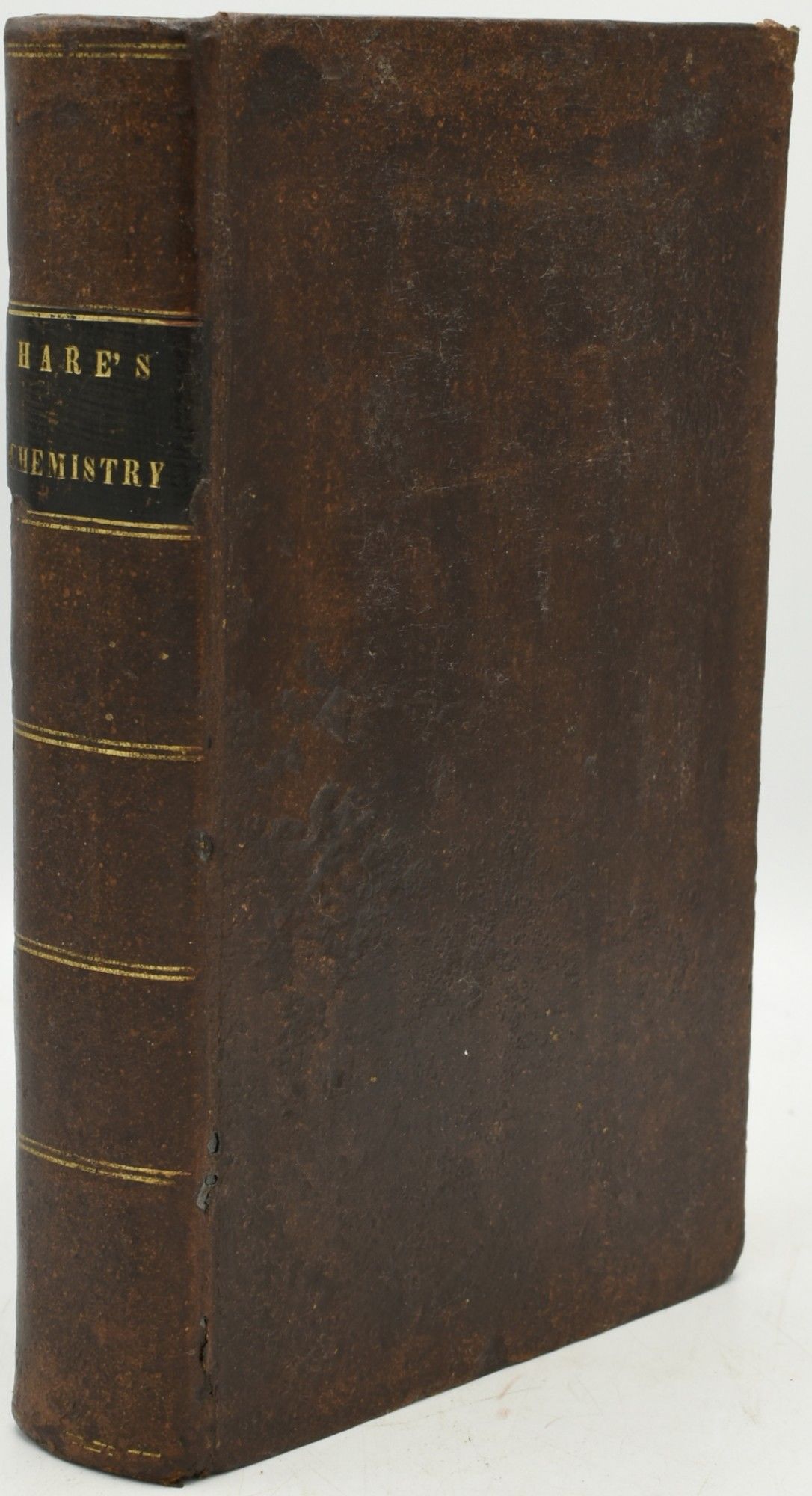 Philadelphia: J. G. Auner, 1836. Third Edition. Full Leather. Very Good binding. A textbook on Chemistry for use by students of the University of Pennsylvania, written by a university professor, Robert Hare, who also provided his name to the Robert Hare Medical and Dental Library (1878-1969). Numerous plates and text illustrations, depicting the curious chemical instruments and experiments of the day. Toning to the endpapers; contemporary owner's name on the front flyleaf; foxing throughout. Overly mottled calf, with some surface loss to the leather, and a black leather label on the spine. Very Good binding.