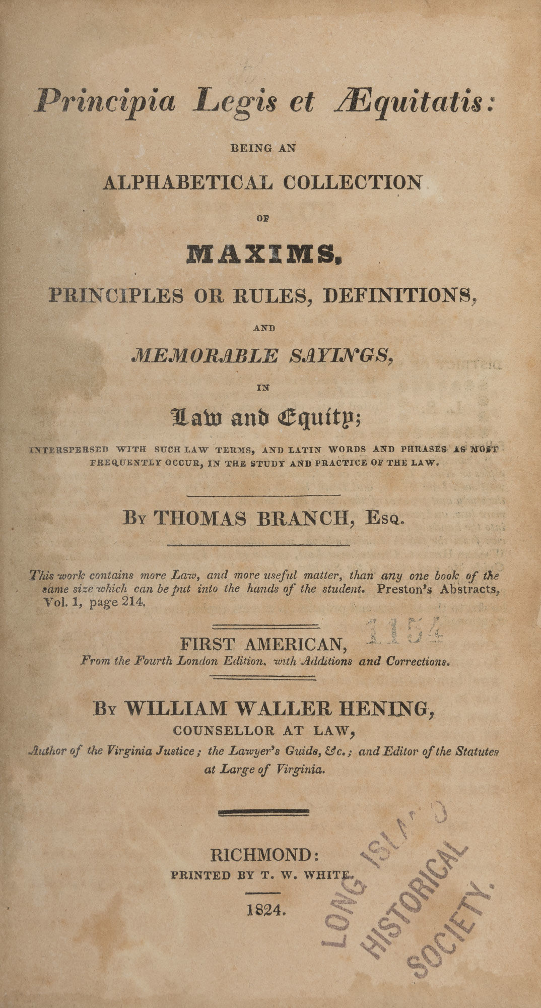 1824. Richmond, VA: Printed by T.W. White, 1824.. Richmond, VA: Printed by T.W. White, 1824. Only American Edition of Branch's Collection of Legal Maxims Branch, Thomas [fl. 1738-1753]. Hening, William Waller [1768-1828], Editor. Principia Legis et Aequitatis: Being an Alphabetical Collection of Maxims, Principles or Rules, Definitions, and Memorable Sayings in Law and Equity. First American, From the Fourth London Edition. With Additions and Corrections. Richmond, VA: Printed by T.W. White, 1824. [viii], [9]-168 pp. Octavo (8-1/4" x 4-3/4"). Recent period-style quarter calf over cloth, lettering piece and blind fillets to spine, endpapers renewed. Moderate toning to text, somewhat heavier in places, light foxing to a few leaves, library stamps to title page. $500. * Only American edition. This popular book was first published in 1753. It went through six English editions, the final appearing in 1824. Based on the fourth London edition (1822), the American edition is enhanced by Hening's additions. According to Marvin, "'As a manual, this little book contains more law and more useful matter, than any one book of the same size which can be put into the hands of the student.' It is more extensive than Noy's Maxims, and 'draws so copiously from the common law reports and writers of the age of Elizabeth, and since that time, that it may be regarded as the accumulated spirit and wisdom of the great body of the English law.'" Marvin's first quote is from Preston on Abstracts, the second from Kent's Commentaries on American Law. Marvin, Legal Bibliography 143. Cohen, Bibliography of Early American Law 5376.