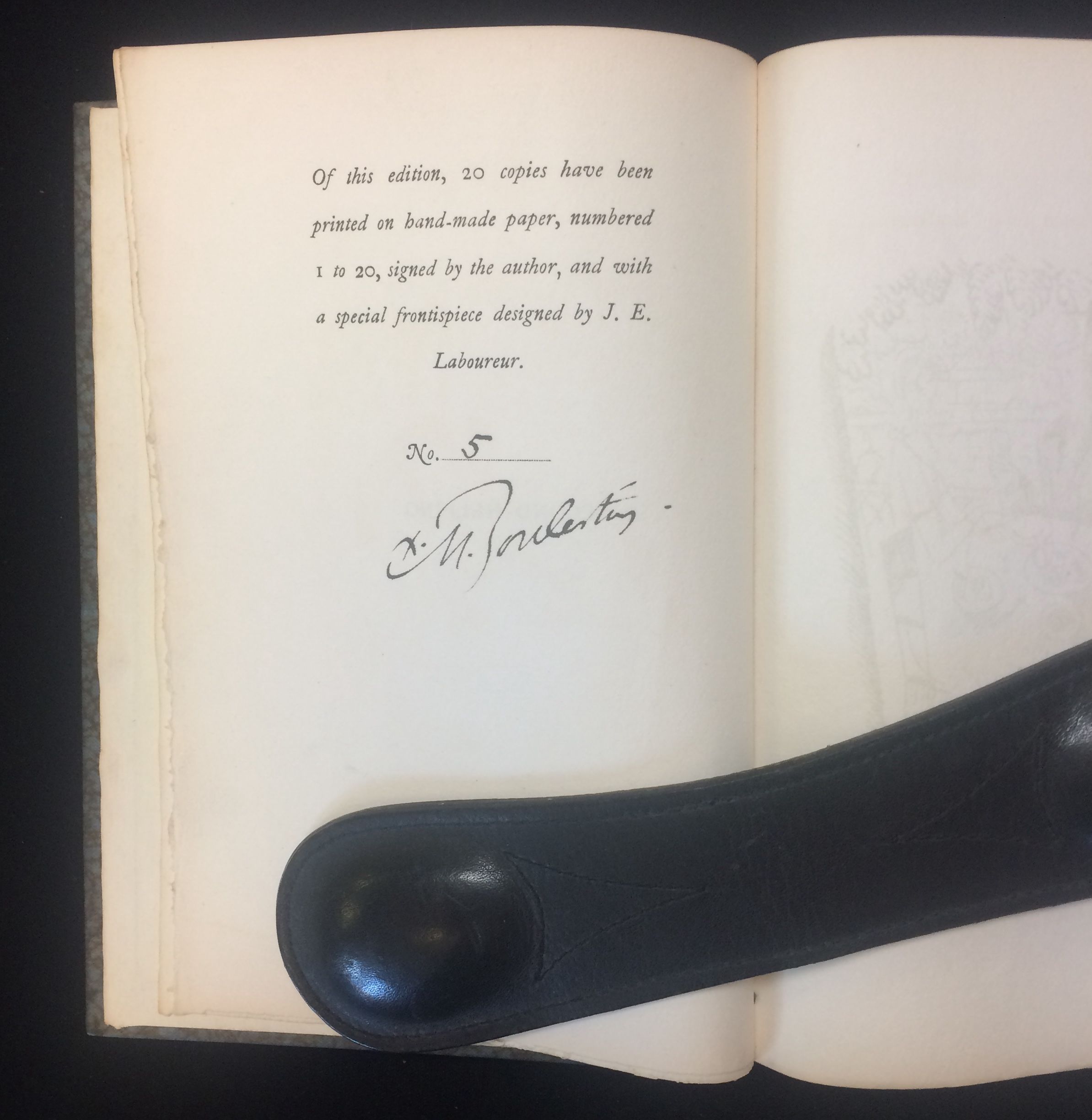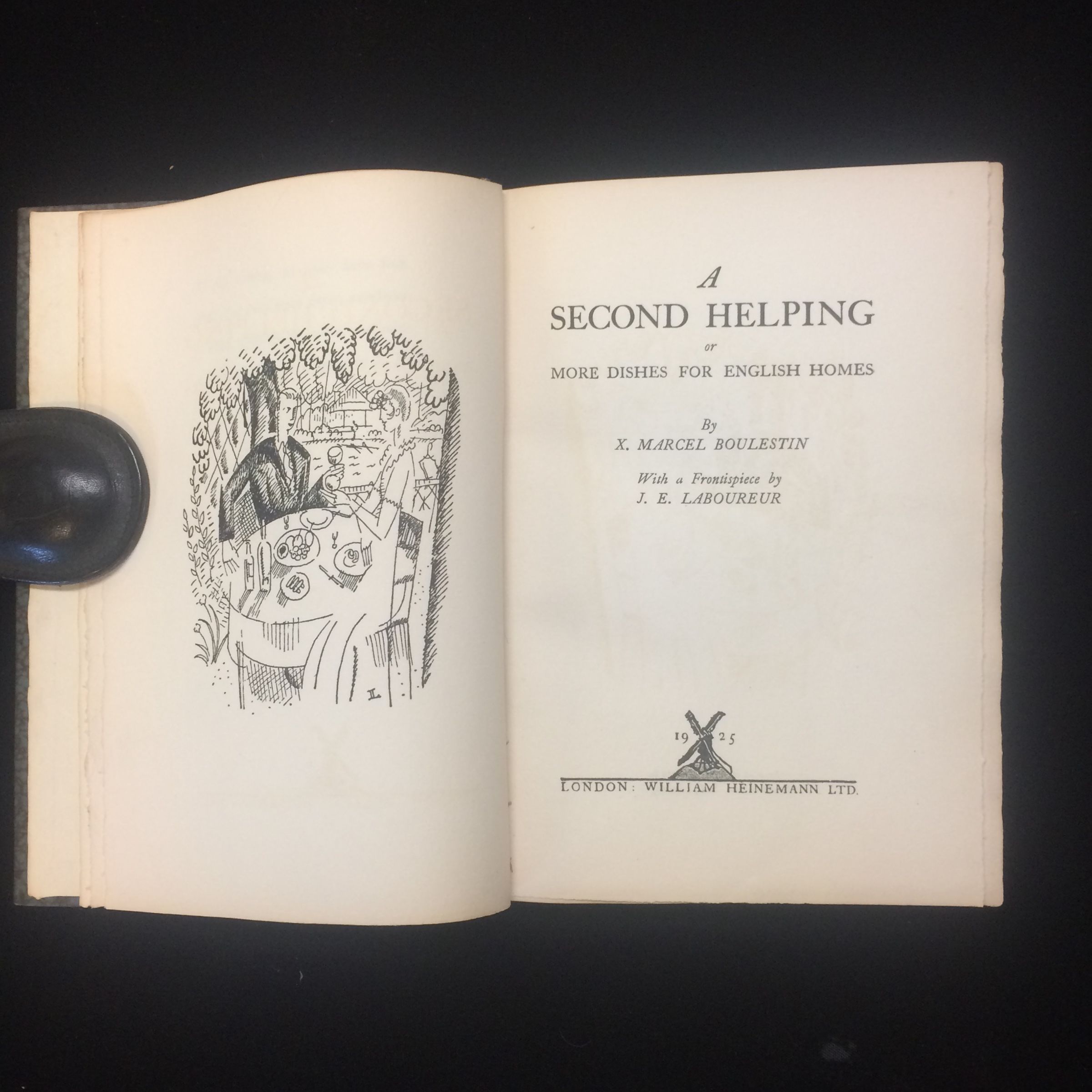 London: William Heinemann, 1925. 1st Edition Limited. Hardcover. Near Fine. The scarce limited edition of this Boulestin title, only 20 copies, this numbered 6 and signed by Boulestin on the limitation page. Printed on hand-made paper, with a special frontispiece designed by J. E. Laboureur. 8vo, sides untrimmed, boards covered in distinctive bluish-gray marbleized-style linen, red stamped titles front and spine. Shallow loss top of spine, less to foot, one corner moderately worn. Internals fine. No names, inscriptions or bookplates and desirable thus.