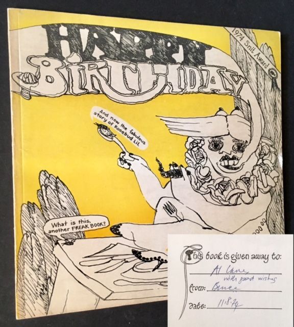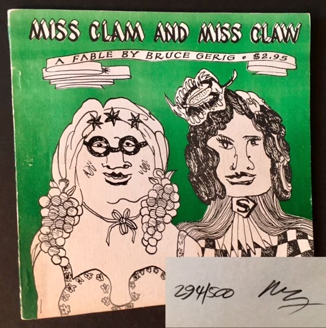 New York: The Poet's Press, 1974. Original wraps. Near Fine. Bruce Gerig. A collection of 3 ribald, underground comics by Bruce Gerig (aka "Jack Knife"). Published between 1973-1974 by New York's Poet's Press, EACH BOOK IS SIGNED AND/OR INSCRIBED BY BRUCE GERIG and each is clean and VG+ to Near Fine in its pictorial wrappers, with very light offsetting and soiling along the rear panels. Tight, square octavos, the 3 volumes are "Miss Clam and Mis Claw", "The Perfect Man" and" Happy Birthday" ("Miss Clam and Miss Claw" being the only of the 3 titles to give a limitation -- #294 of 500 copies issued).