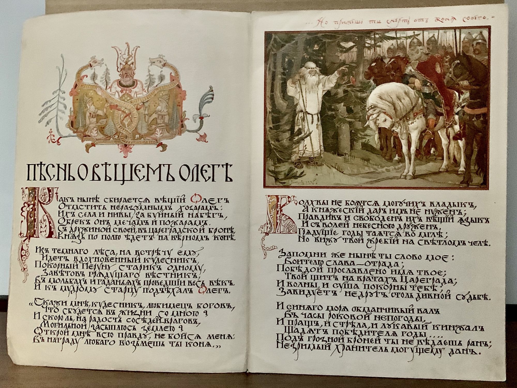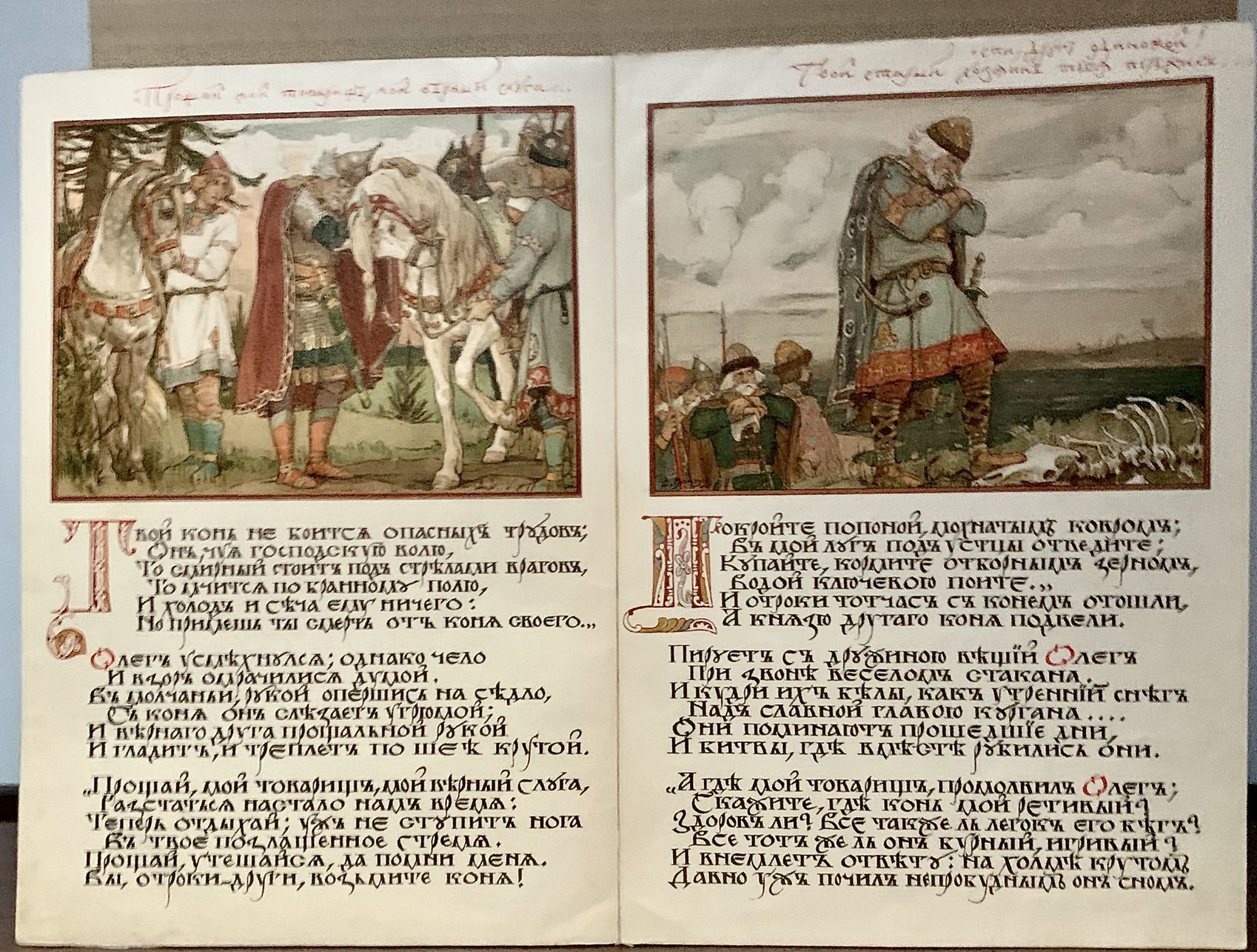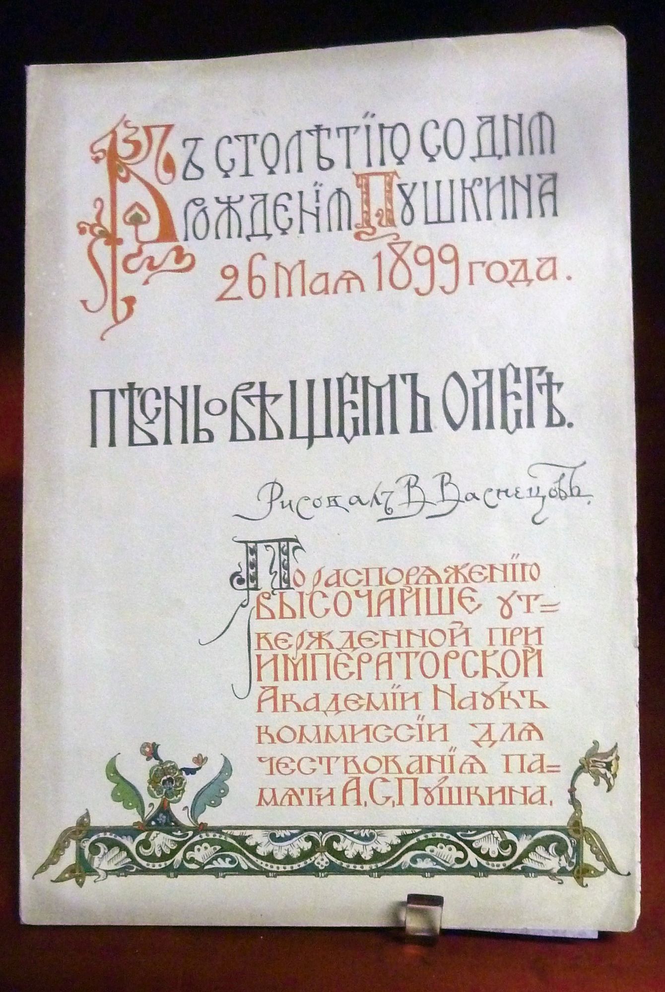 St. Petersburg: Ekspeditsii Zagotovlenya Gosudarstvennykh Bumag, 1899. Stiff Wraps. Orig. color printed cover. Very good/Near fine. Folio, 33 x 23 cm. Four color lithographed plates, decorative initials, and head- and tail-pieces by Vasnetsov. Six accordion-folded leaves, [leporello style] with a printed page as front cover and another as rear cover. Vasnetsov's most famous illustrated work, published on May 26 1899 to commemorate the 100th anniversary of Pushkin's birth. Generally clean and fresh, with tissue guards, text printed in red and black. KILGOUR 897,