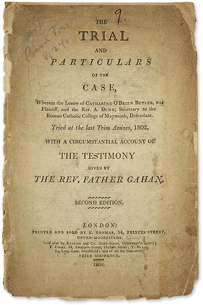 1802. London: Printed and Sold by E. Thomas, 1802. London: Printed and Sold by E. Thomas, 1802. Will the Church Allow Her to Stay on Land Donated by Her Brother? [Trial]. Butler, Cathrine O'Brien [1730-1807], Plaintiff. The Trial and Particulars of the Case, Wherein the Lessee of Catharine O'Brien Butler, Was Plantiff, And the Rev. A. Dunn, Secretary to the Roman Catholic Collage of Maynooth, Defendant. Tried at the Last Trim Assizes, 1802. With a Circumstantial Account of the Testimony Given by the Rev. Father Gahan. Second Edition. London: Printed and Sold by E. Thomas, 1802. 20 pp. Octavo (8-1/2" x 5-1/2"). Disbound pamphlet, all leaves detached, moderate edgewear, soiling to title page and verso of final leaf, "9." in small early hand to head of title page. $350. * Second and final edition, published the same year as the first. This case concerned the will of Catharine O'Brien Butler's brother, John Butler, 12th Baron Dunboyne, who had left his property to the St. Patrick's College, Maynooth. OCLC locates 3 copies, 2 in North America (Emory Pitts Theological Seminary, Newberry Library), which are both first editions. COPAC locates 1 copy (Ushaw College, Durham), which has a second edition.