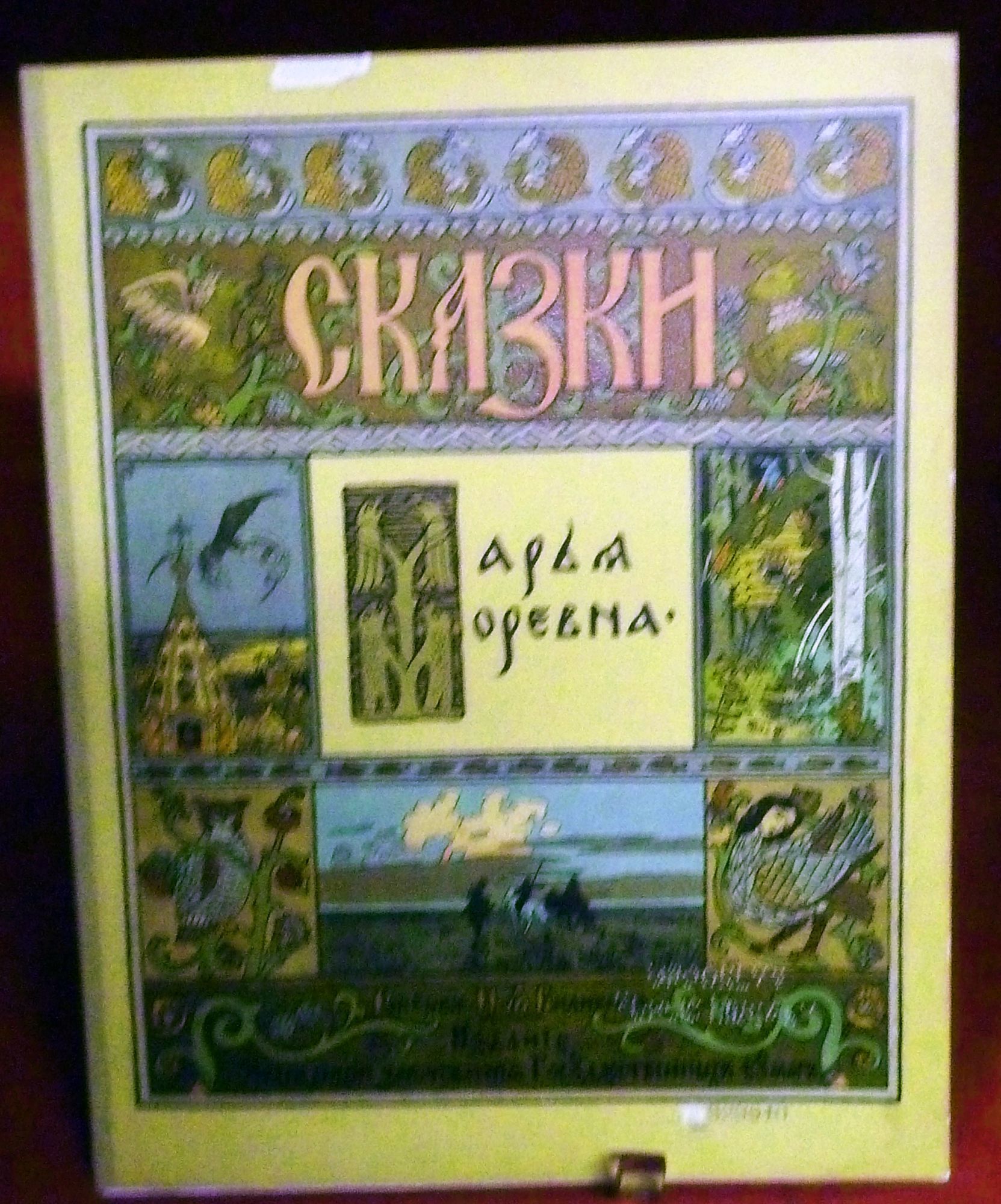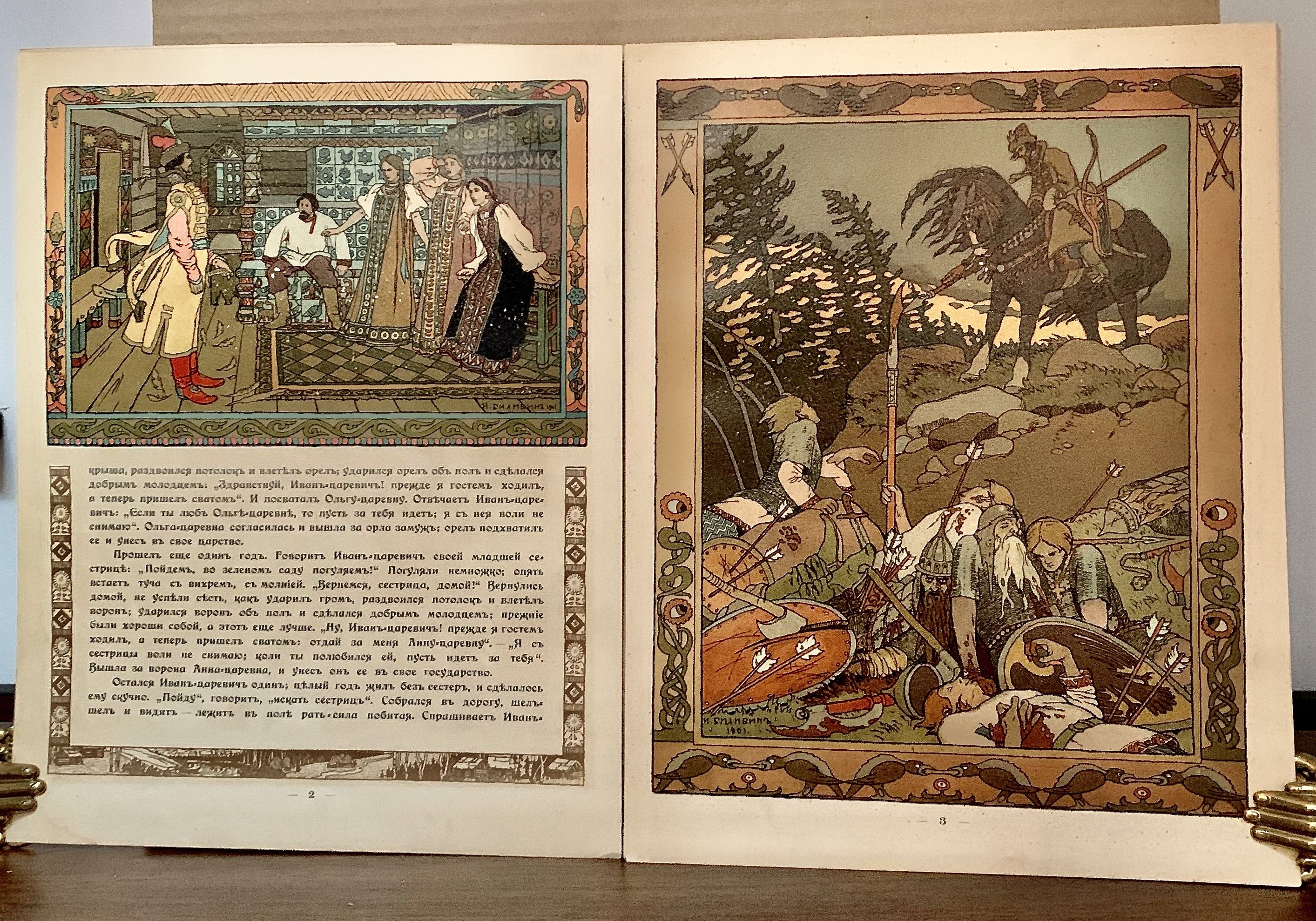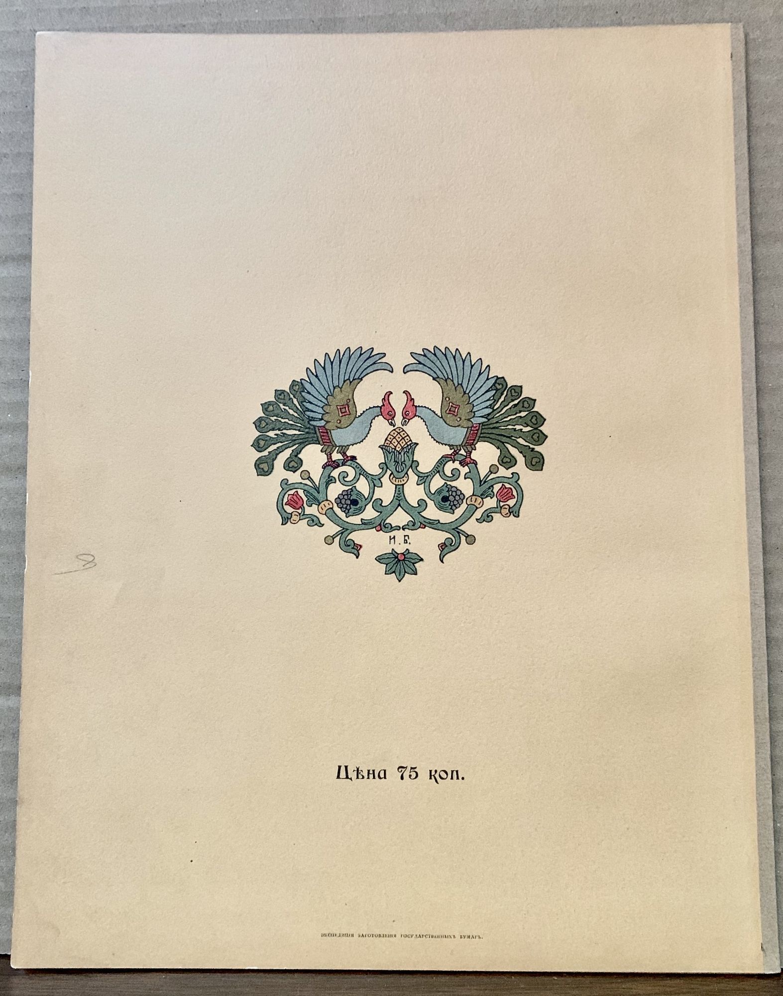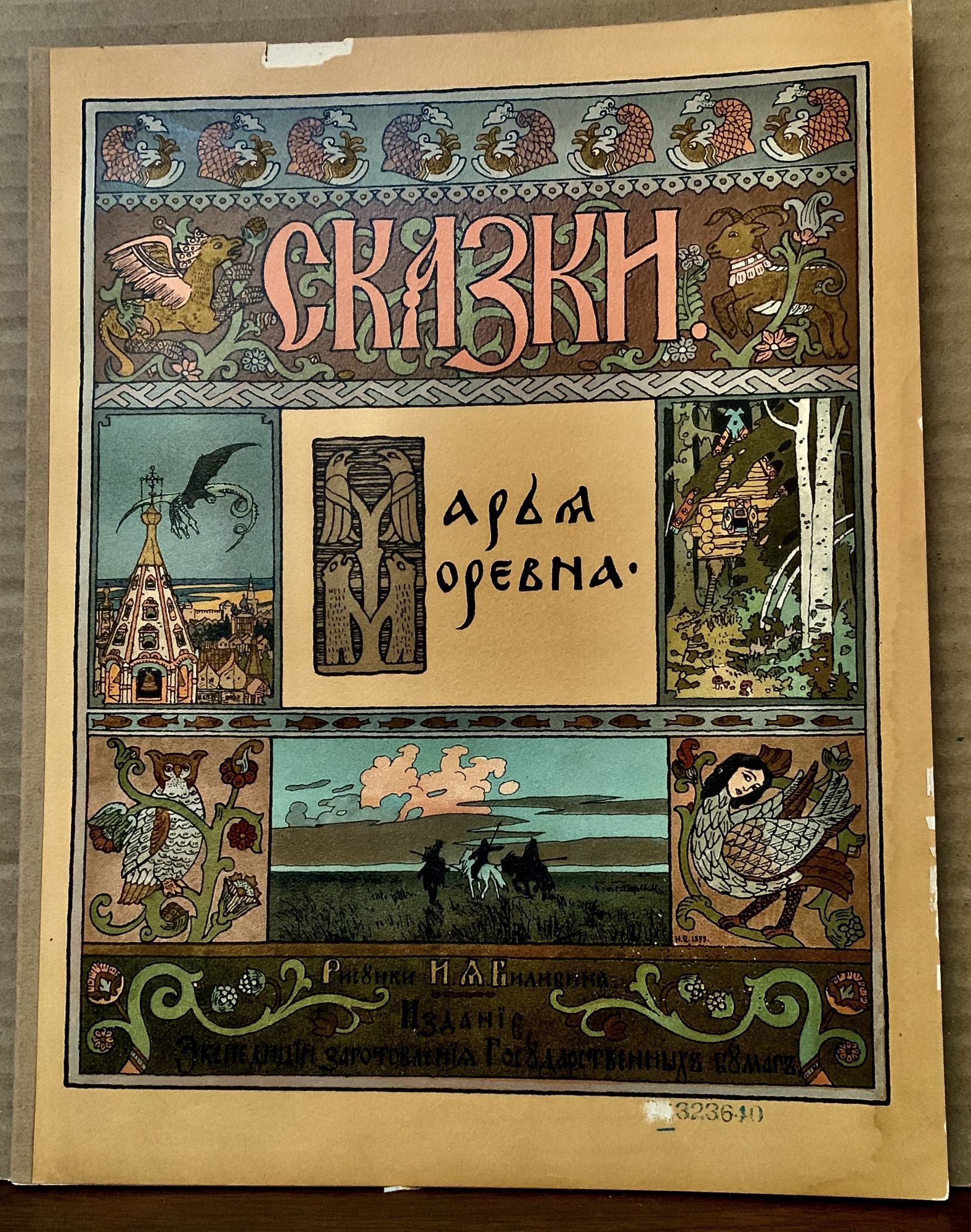 St. Petersburg: State Printing Company for Securities [Expeditsii Zagotovleny Gosudarstvennukh Bumag], 1903. First edition. Stiff Wraps. Orig. illustrated chromolithographic front cover and back covers. Very good. 12 pages. 32.5: 25.5 cm. Original cover chromolithograph, 8 chromolithographed illustrations (including 3 full-page), decorative borders printed in brown, all after Bilibin. Commissioned by the Tsarist government in 1899, this series of skazki [fairy tales] established Bilibin internationally as the foremost interpreter of Russian folk tales. Perforated library stamp lower front cover, small six digit number in blue lower front cover, chip front cover head. Interior, bright, clean and fine.
