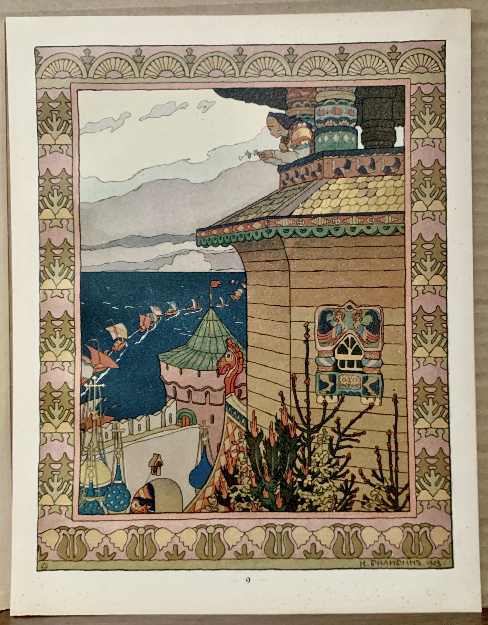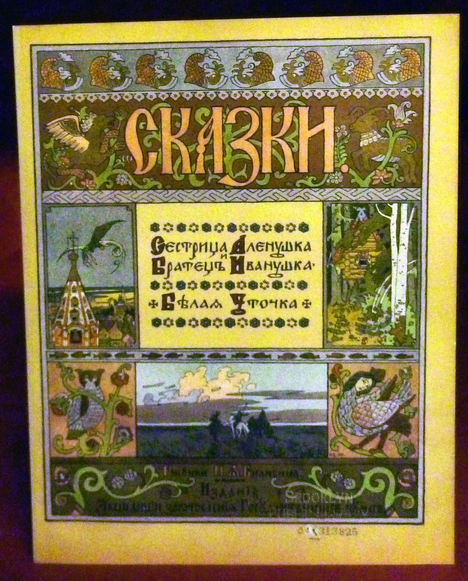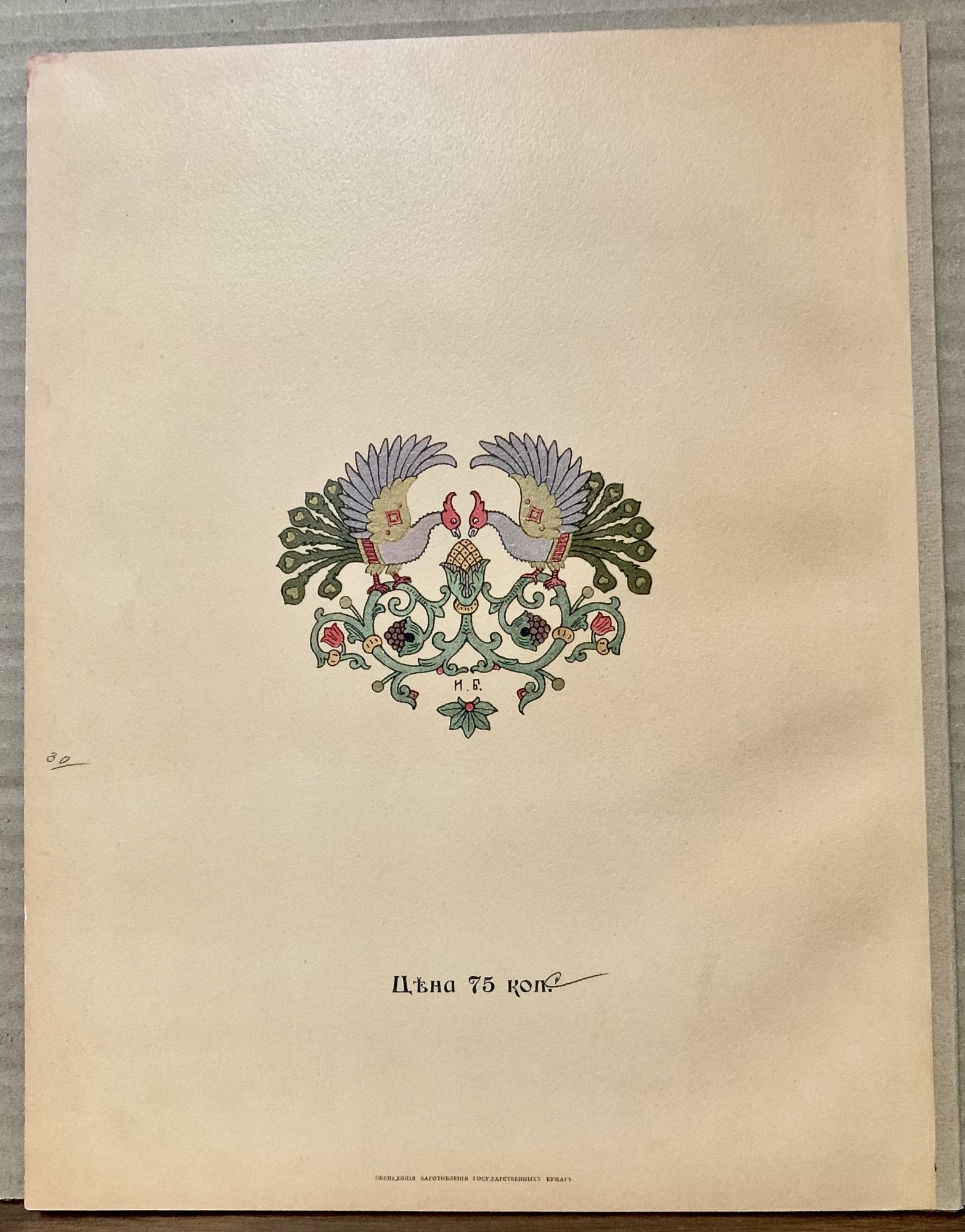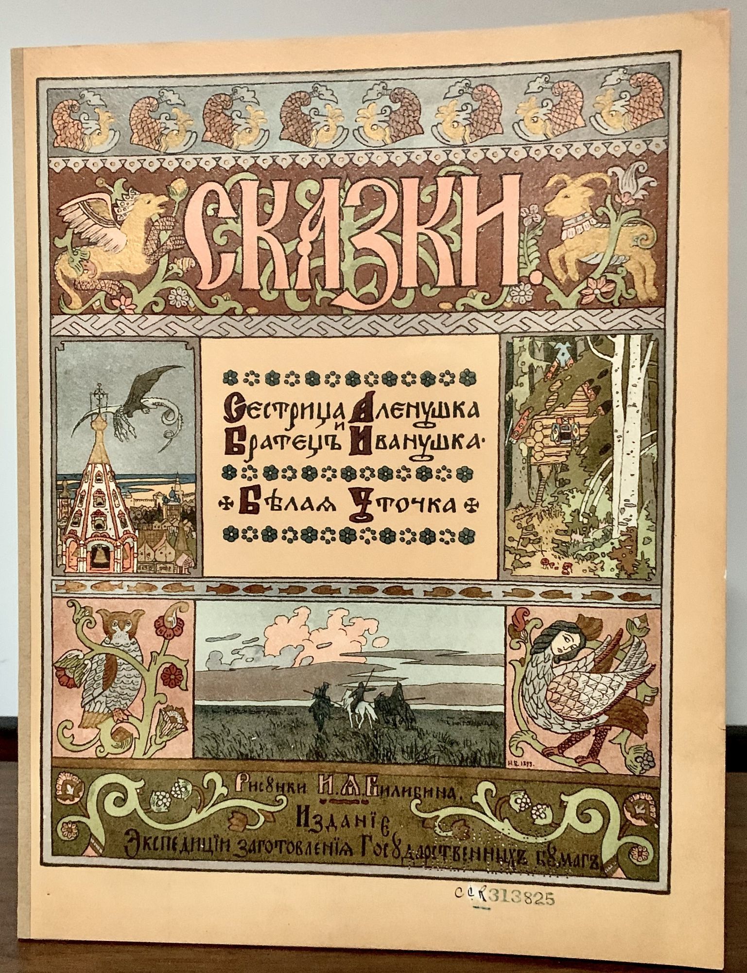 St. Petersburg: State Printing Company for Securities [Expeditsii Zagotovleny Gosudarstvennukh Bumag], 1903. First edition. Stiff Wraps. Orig. illustrated stiff wrappers rebacked. Near fine. 12 pages. 32.5: 25.5 cm. Original cover chromolithograph, 8 chromolithographed illustrations (including 3 full-page), decorative borders printed in brown, all after Bilibin. Commissioned by the Tsarist government in 1899, this series of skazki [fairy tales] established Bilibin internationally as the foremost interpreter of Russian folk tales. Perforated library stamp lower front cover, small six digit number in blue lower front cover. Interior, bright, clean and fine.