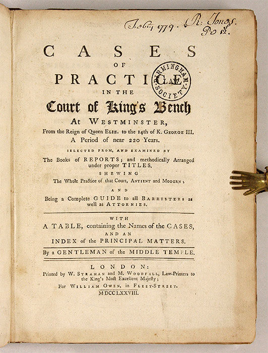 1778. Cases "Shewing the Whole Practice" of the Court of King's Bench [Great Britain]. [Court of King's Bench]. Cases of Practice in the Court of King's Bench at Westminster, From the Reign of Queen Eliz. To the 14th of K. George III. A Period of Near 220 Years. Selected From, And Examined by The Books of Reports; And Methodically Arranged Under Proper Titles. Shewing the Whole Practice of that Court, Antient and Modern; And Being a Complete Guide to All Barristers as Well as Attornies. With a Table, Containing the Names of the Cases, And an Index of the Principal Matters. By a Gentleman of the Middle Temple. London: Printed by W. Strahan and M. Woodfall, 1778. [iv], ii, [10], 256, [24] pp. Quarto (10-3/4" x 8-1/2"). Contemporary calf with later buckram rebacking, blind fillets to boards, library name to front, library insignia to rear, raised bands, calf lettering piece and gilt library name to spine, hinges reinforced with cloth tape. Light rubbing to boards, heavier rubbing to extremities with wear to corners, library bookplate to front pastedown, a few cracks to text block. Moderate toning to text, somewhat heavier in places, brief annotations in early hand in a few places, small library stamps to title page and a few other leaves. $200. * Only edition. The contents, derived from cases reported from 1558 and 1775, are arranged alphabetically by topic. "The advantage of such a compilation to the Barrister and the Attorney is manifest. The former sees at one view, without the trouble of turning over the voluminous reports of ages, all they contain on the subject of his enquiries: the latter hath the same advantage.... For understanding the practice of the court, the attorney should assist himself by every means he can;-for other questions that come before the court, he must apply for the information and assistance of the bar. This was the line that formerly separated the two parts of the profession from each other, and which, if gone into some disuse in these enlightened times, doth not always turn out to the advantage of the suitor" (Preface). English Short-Title Catalogue T95695.