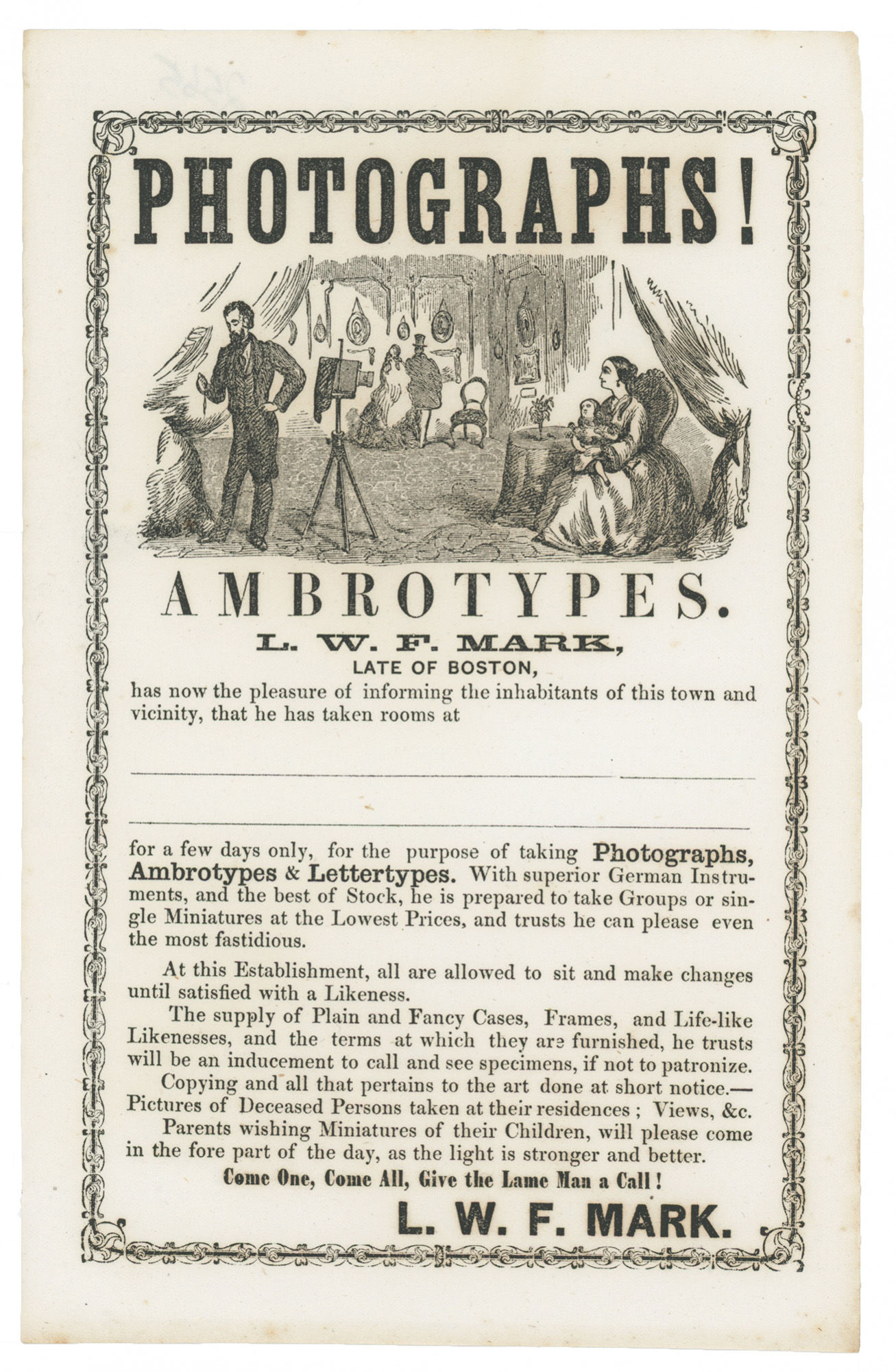 New England, 1850. First Edition. 6 1/2 x 9 inches. Fine. A charming broadside advertising the services of the itinerant photographer L.W.F. Mark of Boston and his photographic equipment. Itinerant photographers travelled through towns offering their services beginning with the invention of the daguerreotype in the late 1840s and continuing through the eras of varied photographic processes. This example is most likely from the late 1850s or early 1860s, though it is undated, as tintypes replaced ambrotypes by the early 1860s. The broadside advertises his “superior German Instruments, and the best of Stock,” promises “to please even the most fastidious” and implores potential customers to “Come One, Come All, Give the Lame Man a Call!” It is unclear what this refers to, as the illustration of the photographer gives no hint as to his ailment.