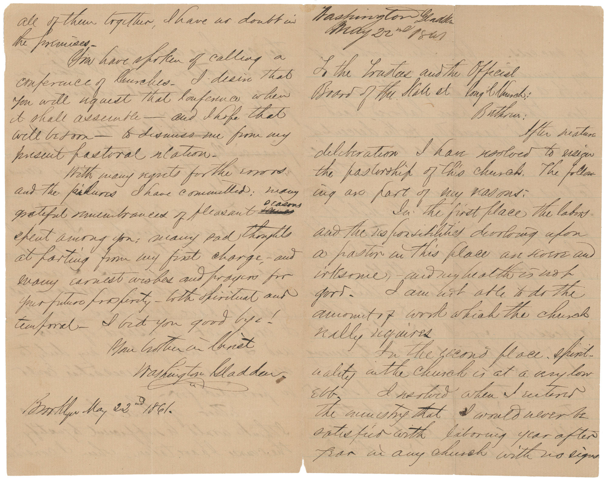 New York, 1881. 4 pp, single 9 ½ x 7 ½ inch leaf, folded. Very Good. An important document from early in the career of Washington Gladden, a key figure in the Social Gospel and Progressive movements. He writes the board of the State Street Congregational Church, explaining the reasons for his resignation, which include the spiritual bankruptcy of the congregation, his poor health and the inability of the church to pay his salary. Of these subjects, it’s the spiritual health of the congregation that seems to trouble him the most. He writes: “Spirituality is at a very low ebb… I would never be satisfied with laboring year after year in any church with no signs of success… it saddens me today that the tokens of good have been very few…. I had hoped and longed for spiritual prosperity among you.” An interesting document that sheds light on Gladden’s reasons for leaving his first position. The American National Biography states his reasons for leaving as a “mental breakdown,” though this letter may suggest that he had thought out his decision to a greater degree. Partial tears at folds but still very good.