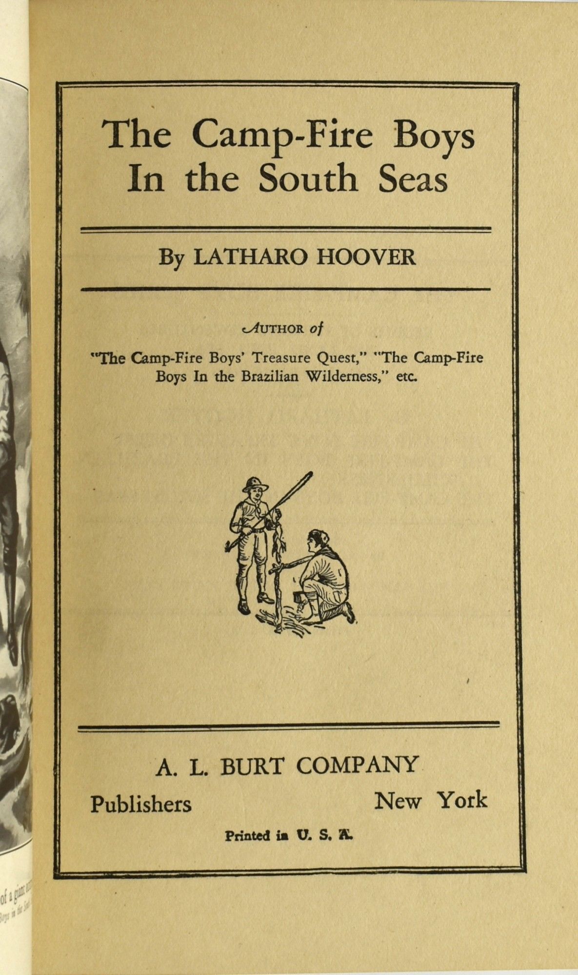 THE CAMP-FIRE BOYS IN THE SOUTH SEAS Hard Cover New York: A. L. Burt Company, 1929 By Latharo Hoover New York: A. L. Burt Company, 1929. Hard Cover. Very Good binding. With no marks. Decorated orange cloth, with slight sunning and shelfwear to the spine. Very Good binding.