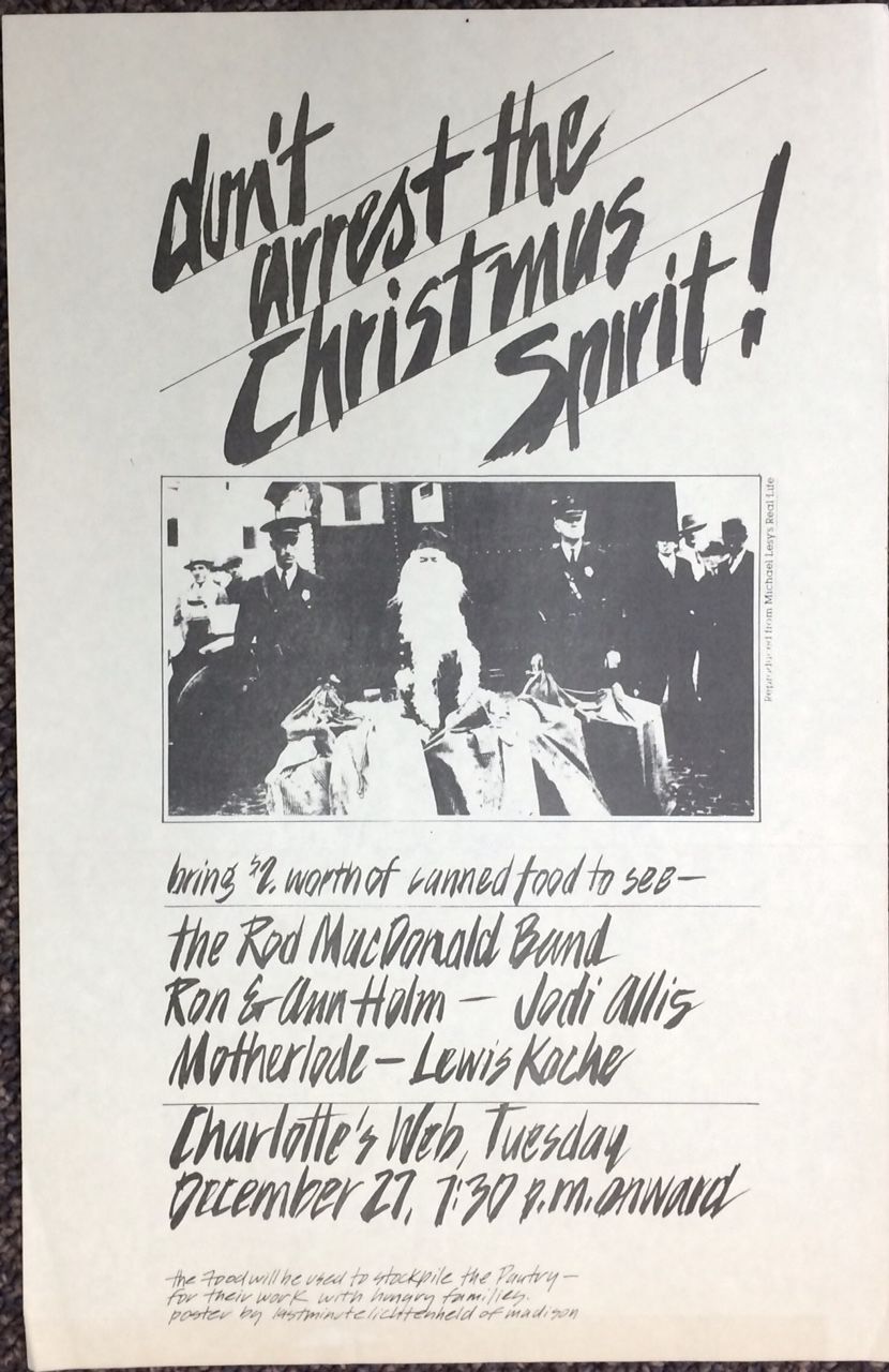 [Madison, WI-?], n.d..  11x17 inch poster, neat fold crease and mild toning; asks the reader to bring $2 worth of canned food for the pantry at Charlotte's Web for the chance to see the Rod MacDonald Band, Ron and Ann Holm, Jodi Allis, Motherlode, and Lewis Koche. Poster design is credited to "lastminute lichtenheld of Madison." Blurry image of Santa getting arrested, from Michael Lesy's book "Real Life.