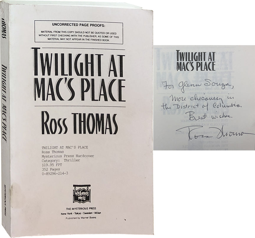 New York: The Mysterious Press, 1990. Uncorrected Proof. Paperback. Near Fine/Near Fine. Inscribed by Thomas on the half-title page. About Very Good. Wraps generally rubbed, some loss of text at the head of the spine, a stain on the front. Square and firmly bound, clean internally. A McGorkle and Padillo mystery.
