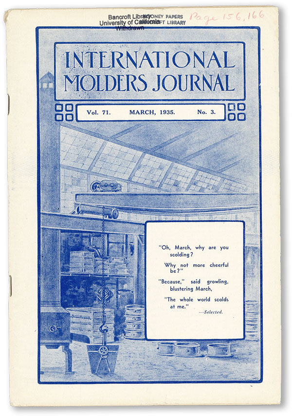 Cincinnati: International Molders' Union of North America, 1935. First Edition. Octavo. Single issue in original pictorial wrappers; pp.130-193; mild external wear; Very Good and complete. Withdrawal stamp on front cover from Bancroft Library, University of California, Tom Mooney Papers. Brief red pencil notation to front wrapper. Two brief articles on the Tom Mooney case; coverage of Pres. Roosevelt's national address to labor; etc. This issue is a duplicate from the original archives of the Tom Mooney Molders Defense Committee.