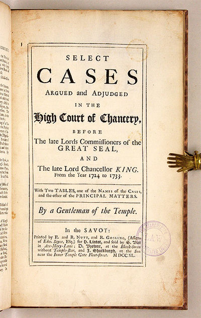 1740. Chancery Cases, 1724-1733 [Great Britain]. [Court of Chancery]. Select Cases Argued and Adjudged in the High Court of Chancery, Before the Late Lord Commissioners of the Great Seal, And the Late Lord Chancellor King. From the Year 1724 to 1733. With Two Tables, One of the Names of the Cases, And the Other of the Principal Matters. By a Gentleman of the Temple. [London]: Printed by E. and R. Nutt, And R. Gosling, 1740. [vi], 82, [8] pp. Publisher catalogue to verso of half-title. Folio (12-1/2" x 7-3/4"). Recent quarter calf over marbled boards, blind fillets to boards (running parallel to joints), lettering piece and blind and gilt fillets to spine, endpapers renewed. Moderate toning to text, light foxing, finger smudges and soiling to a few leaves, light edgewear to preliminaries, early repair to lower corner of half-title, library stamps to title page and foot of final leaf. $350. * First edition. Includes cases from 11 Geo. I to 7 Geo. II. Originally undervalued, this set of reports attracted favorable attention later and had a second edition in 1850 that was reprinted the next year in Philadelphia. English Short-Title Catalogue T96773.