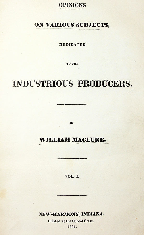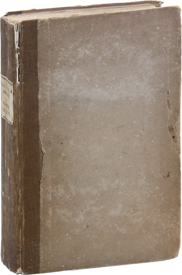 New-Harmony, IN: Printed at the School Press, 1831. First Edition. Second (and best) issue, text extended to p. 640. Two volumes in one; octavo (24cm.); original muslin-backed boards, printed spine label, leaves untrimmed; [4],640pp. Boards rubbed with some brief exposure at corners and upper cover fore-edge, spine and joints cracked but holding, paper flaw to front pastedown from partially effaced ownership signature, occasional foxing throughout textblock, else Very Good, internally clean and sound. Text ends mid-sentence at end of Vol. 2, though the third volume did not appear until 1838 and is treated as bibliographically separate. Notice and errata leaf bound in after Vol. 1 title page, stating that "Six of the following essays were written at Paris, in the year 1819, at the request of the editor of the 'Revue Encyclopedique,' for publication in that work; but they were excluded by the Censors of the press, as too democratic." The repressed essays were subsequently translated into Spanish and published in Madrid, Maclure having travelled to Spain in the hopes of founding an agricultural school "for the common people, in which labor should be combined with instruction" (DAB 12, p. 136). Maclure purchased 10,000 acres of land outside Alicante, but had to relinquish these after the overthrown of Cortes when the land was restored to the Church. From Spain Maclure travelled to Robert Owen's community of New Lanark in Scotland, which in turn inspired him to travel overseas to the Owenite community of New Harmony, where his early articles appeared in the Gazette; the remaining essays were publishing in the "Disseminator of Useful Knowledge" and the "Disseminator," both issued in New Harmony. Along with his writings, Maclure also founded the New Harmony Working Men's Institute, in 1838, just two years before his death. BYRD & PECKHAM 444; HOWES M-162; SABIN 43554; STREETER 4241.