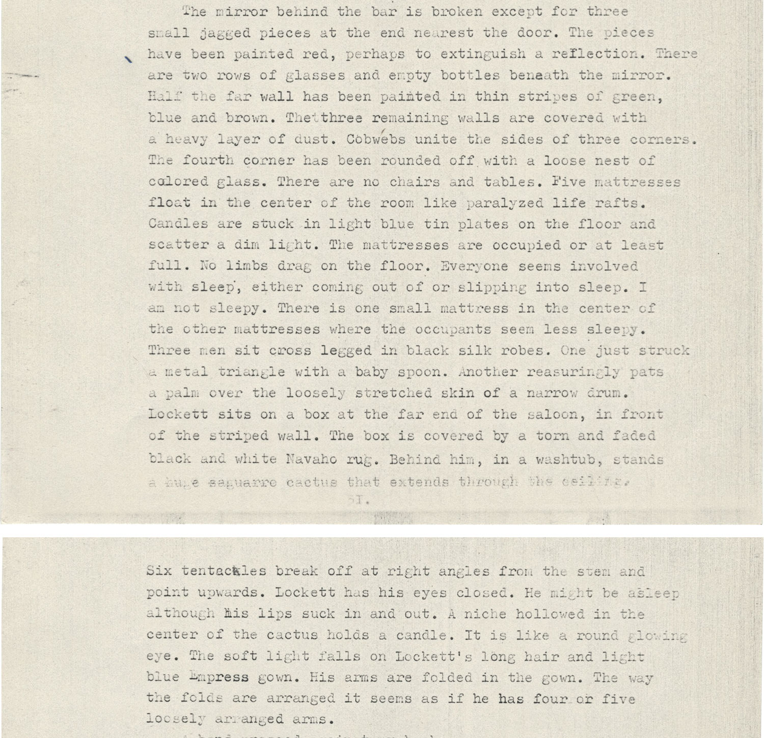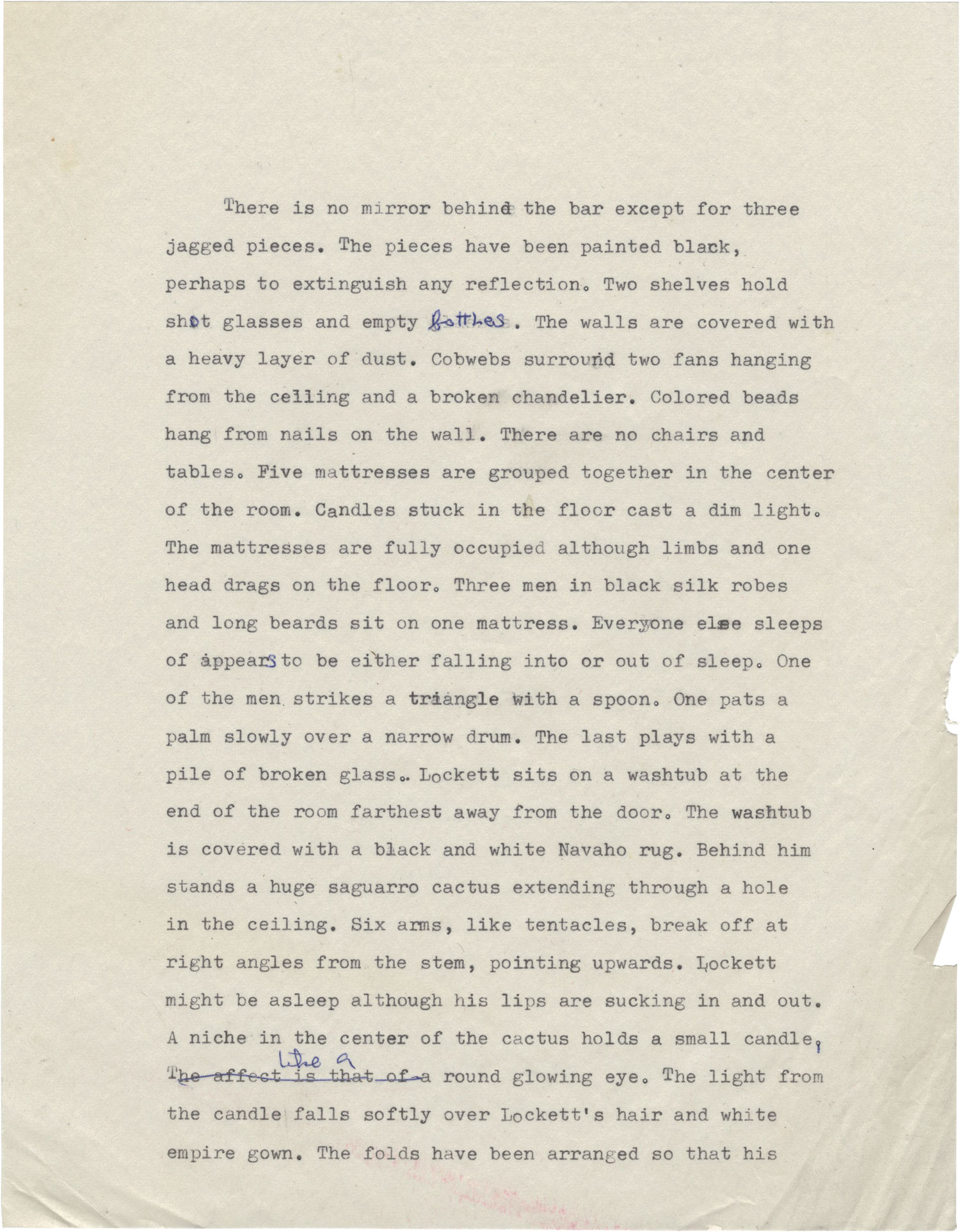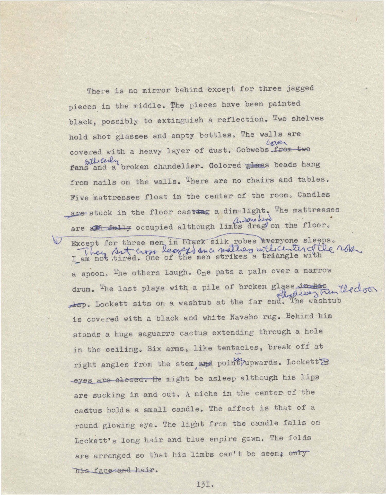 Included in the archive is a first draft of the novel with significant differences in both text and structure from the published version, and extensive revisions, deletions, and corrections to the text by Wurlitzer. Most importantly, the manuscript contains an unpublished final chapter, mirroring the first chapter in structure and providing a completely different ending than the published novel, which concludes with the penultimate chapter of this manuscript draft. 177 pages, rectos only, with both typescript and xerographically duplicated pages, with manuscript ink and pencil, copied, and typed annotations throughout. Also included in the manuscript in a xerographically duplicated copy of Wurlitzer's story "Octopus," as it appeared in the Summer 1966 issue of the "Paris Review."
