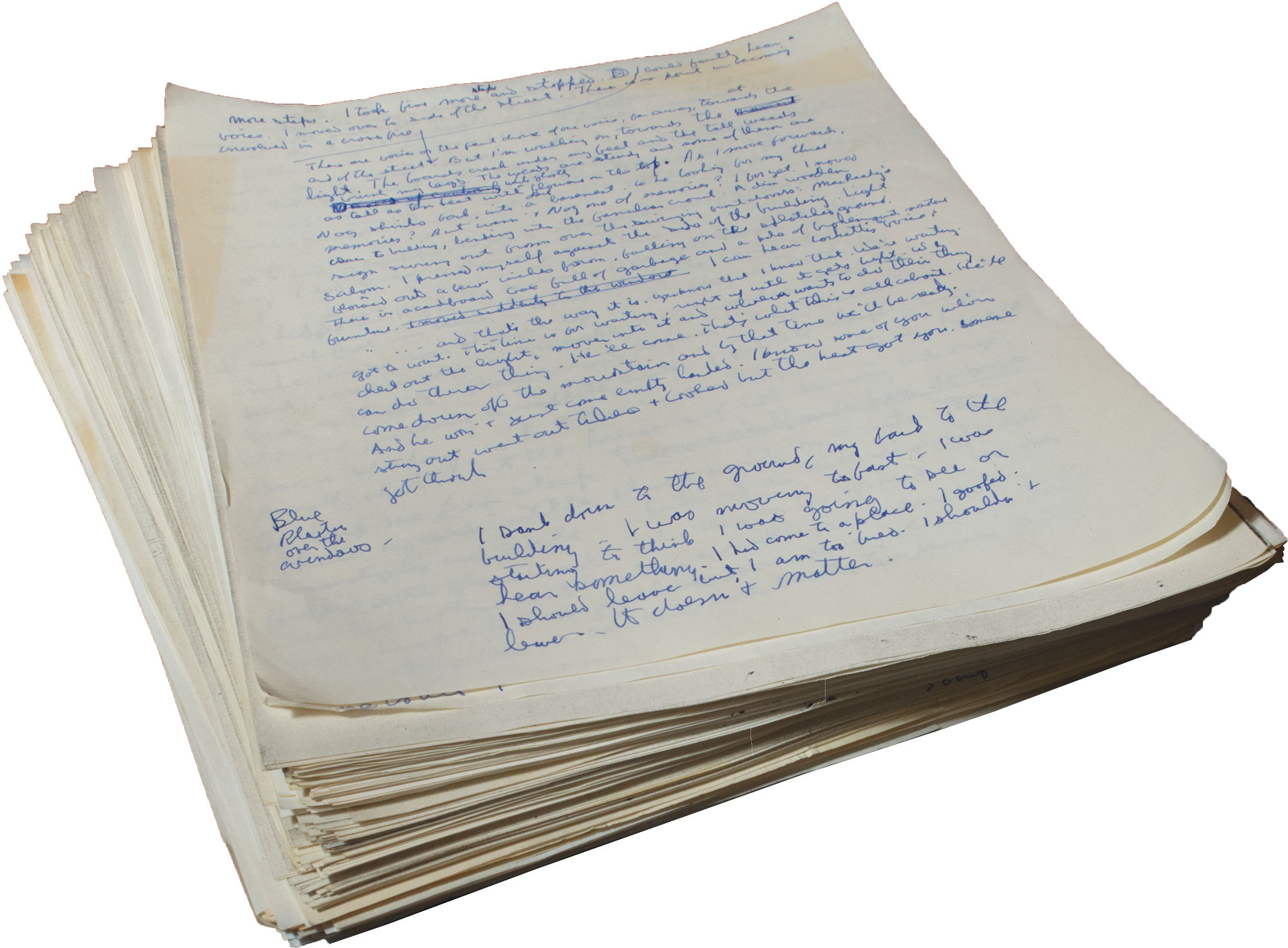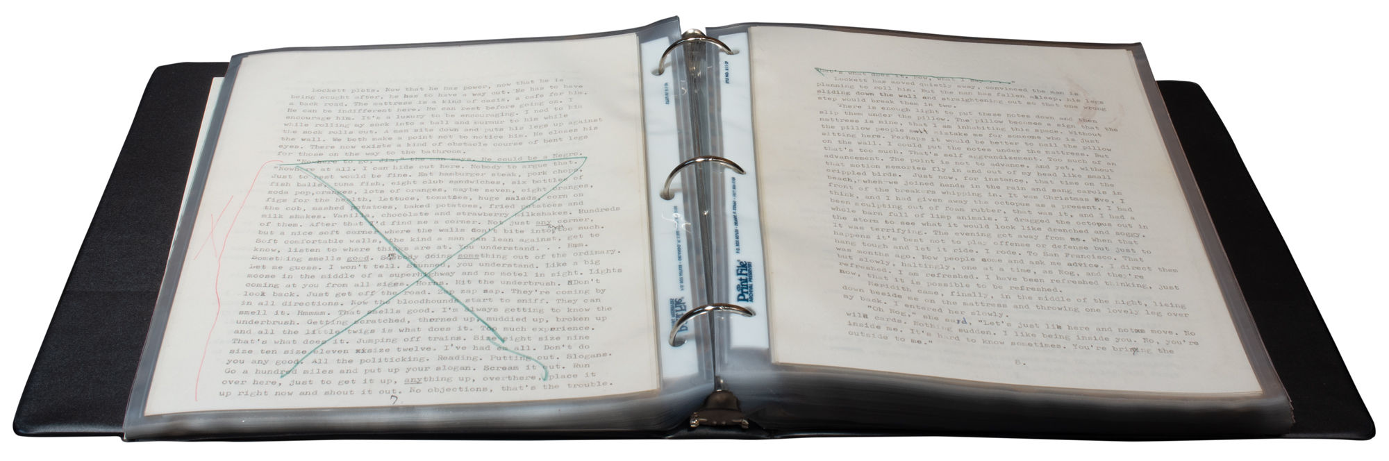 In addition to the heavily revised manuscript, the archive contains approximately 320 loose manuscript pages, containing rewrites and edits to content of the novel, including multiple versions of the same pages or passages, primarily a mix of typescript and xerographically duplicated pages, with extensive manuscript, copied, and typed annotations throughout, and with occasional handwritten pages of text or notes also present.