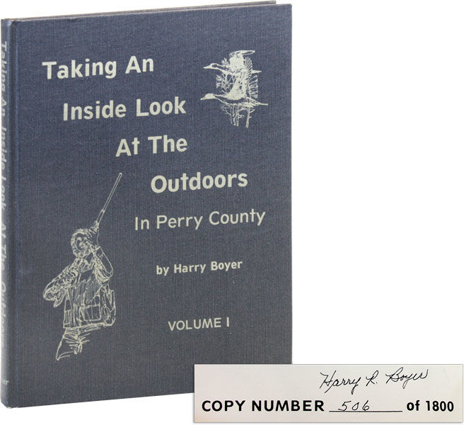 Newport, PA: The News Printery, 1984. First, Limited Edition. First printing. Quarto (28.5cm.); black publisher's cloth-covered boards with gilt lettering, no dustwrapper; VI,141pp. Textblock displays mild handling wear and yellowing to edges. Final pages of book are blank, but have some tears and creases; else pages are clean and sound. Boards slightly worn on surfaces, with some trivial rubbing to edge corners and along crown/heel of spine. Overall a Near Fine or better copy. An accomplished outdoorsman, Boyer also produced a column for The News-Sun, a newspaper based in Newport, PA. In this book, he shares his insights on hunting, fishing, and gun and animal control-related legislative issues of the time. This is a signed copy, number 506 of a limited run of 1800. This book also has a gift inscription from an unknown party on front free endpaper.