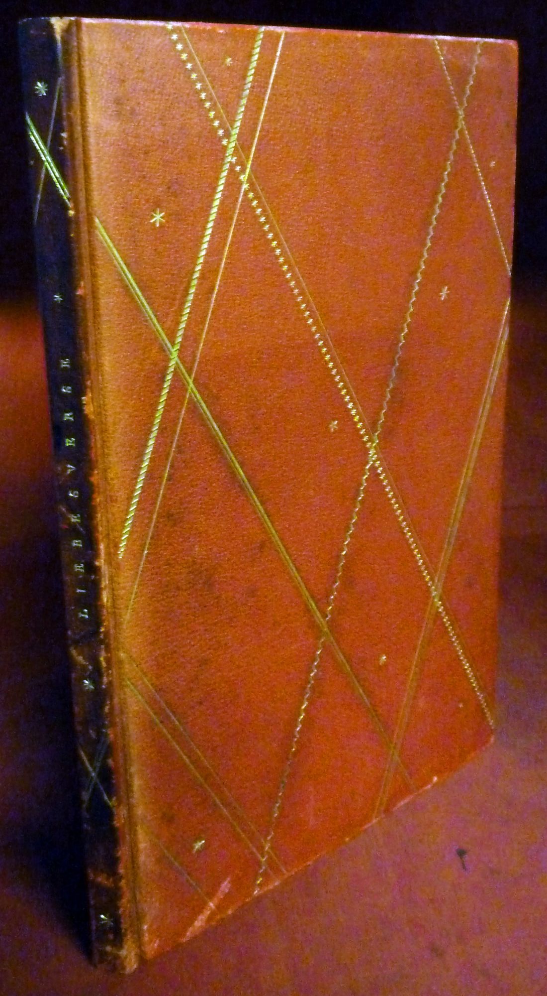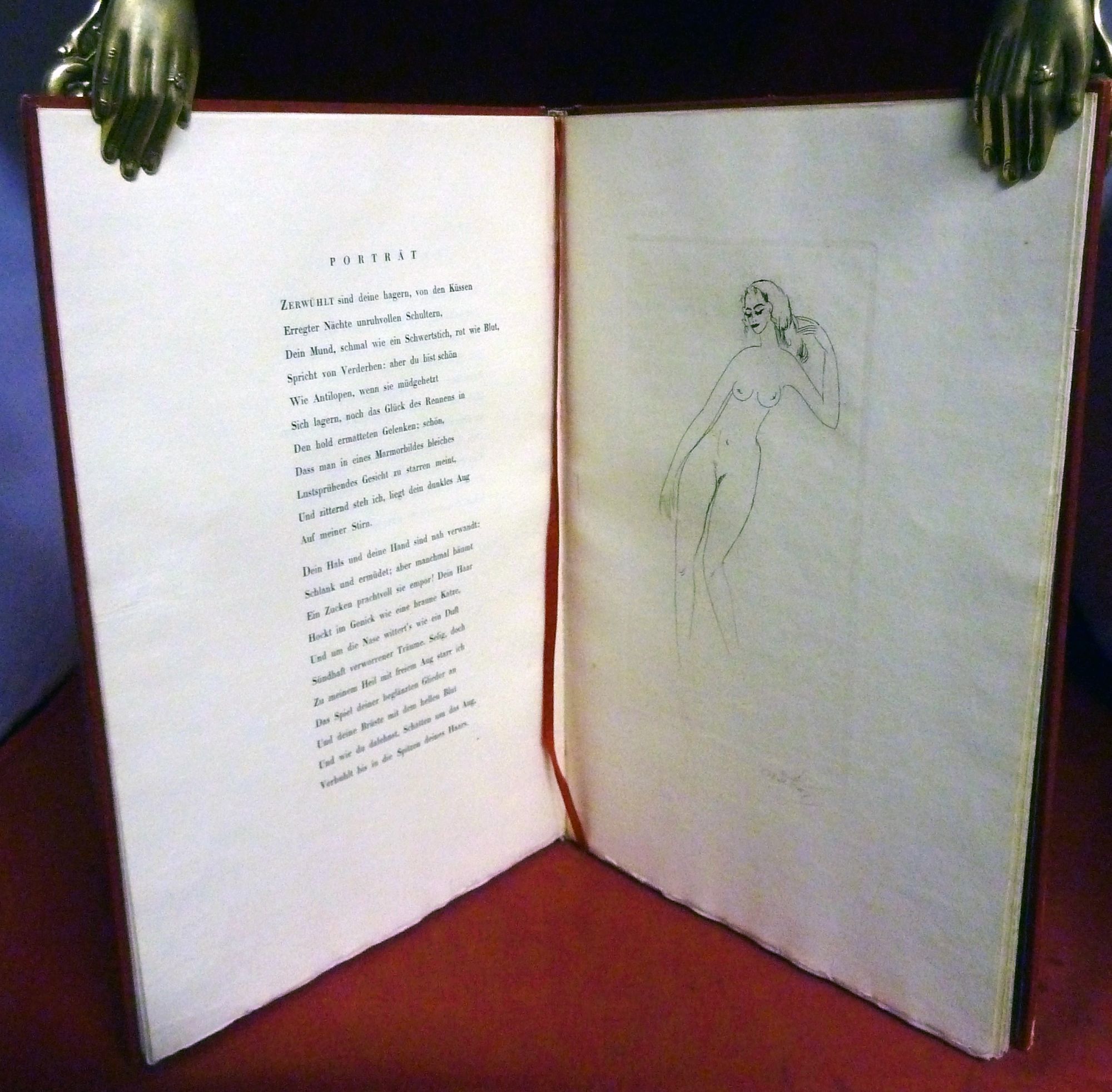 Leipzig: Privatdruck, 1922. First edition. leather_bound. Orig. full red morocco. Teg. Very good. Unpaginated. 29.3 x 19 cm. Limited edition, copy 12 of 20 Deluxe leather bound copies signed by Bethge and Mathey (from total edition of 150). Etched title vignette and six full page etchings signed by Mathey, and printed in Haenel-Antiqua on Zanders-Butten hand made paper. Privately printed at the Werkstatten der Staatlichen Akademie fur Graphische Kunste und Buchgewerbe zu Leipzig. From the collection of Crosby Gaige with his bookplate. RODENBERG 187. Metallic gold endpapers with gilt stamped binding by Hubel & Denck. Extremity and spine wear.