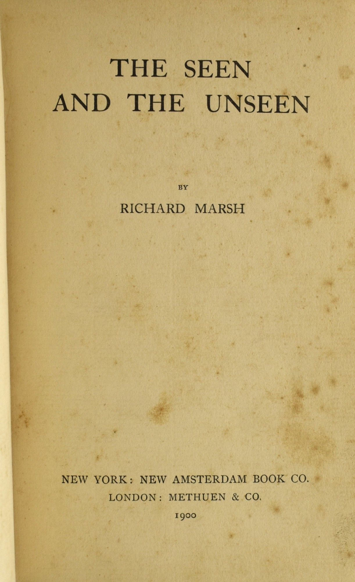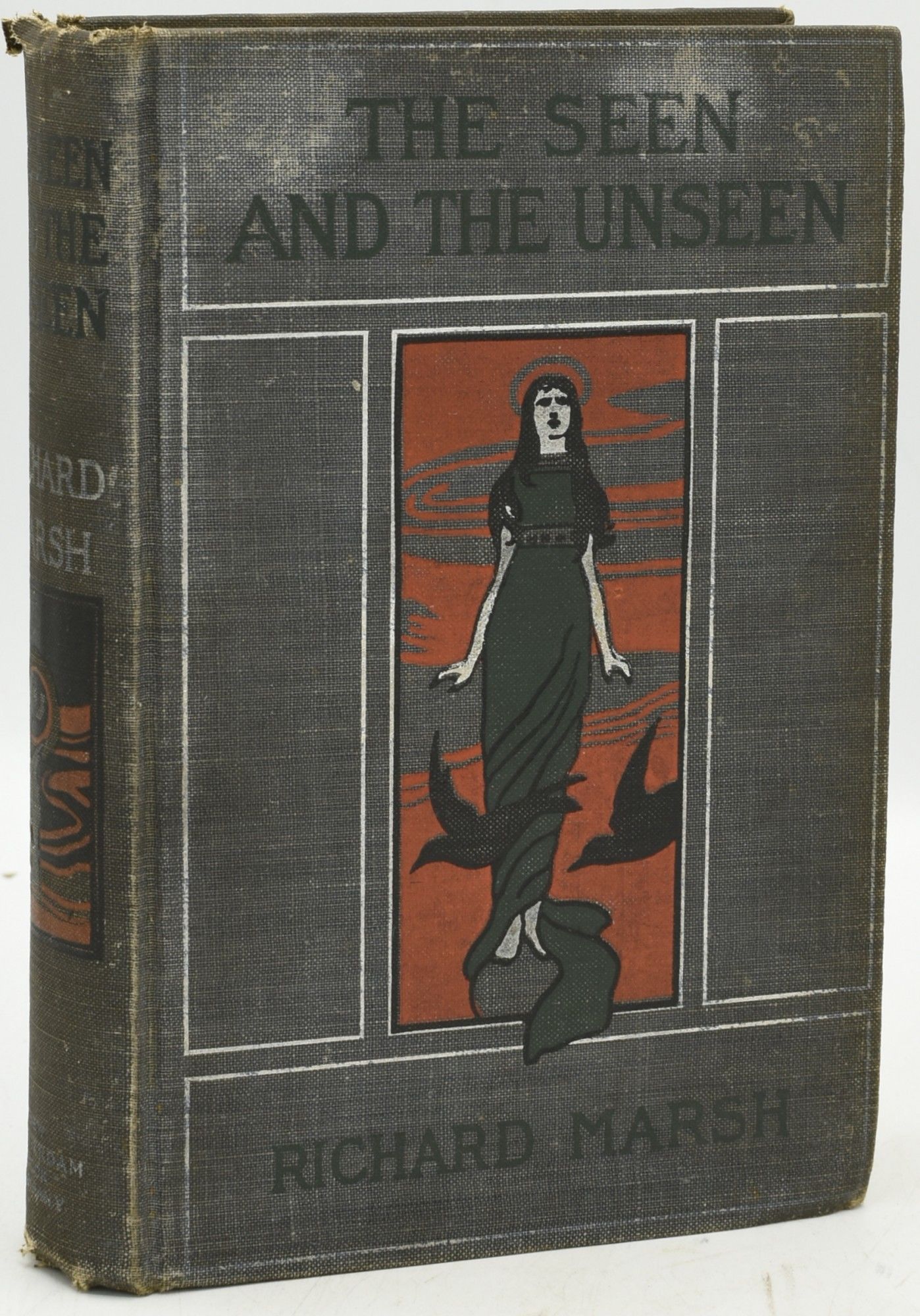 New York; London: New Amsterdam Book Co.; Methuen & Co, 1900. First US Edition. Hard Cover. Good binding. A collection of supernatural tales by Richard Marsh, who is described by Bleiler as a "British author of popular fiction, frequent contributor to variety periodicals around the turn of the century. Work in general is sometimes ingenious in idea but badly, even shoddily, executed." Library stamp on the pastedowns, and previous owner's name on the front flyleaf. Foxing to the preliminaries. Some discoloration to the binding, sunning to the spots, and wear to the edges of the spine. Decorated gray cloth, with lettering and illustration in green, red, and white. OCLC notes thirteen institutional holdings. (Barron 3-142 | Bleiler 1115). Good binding.