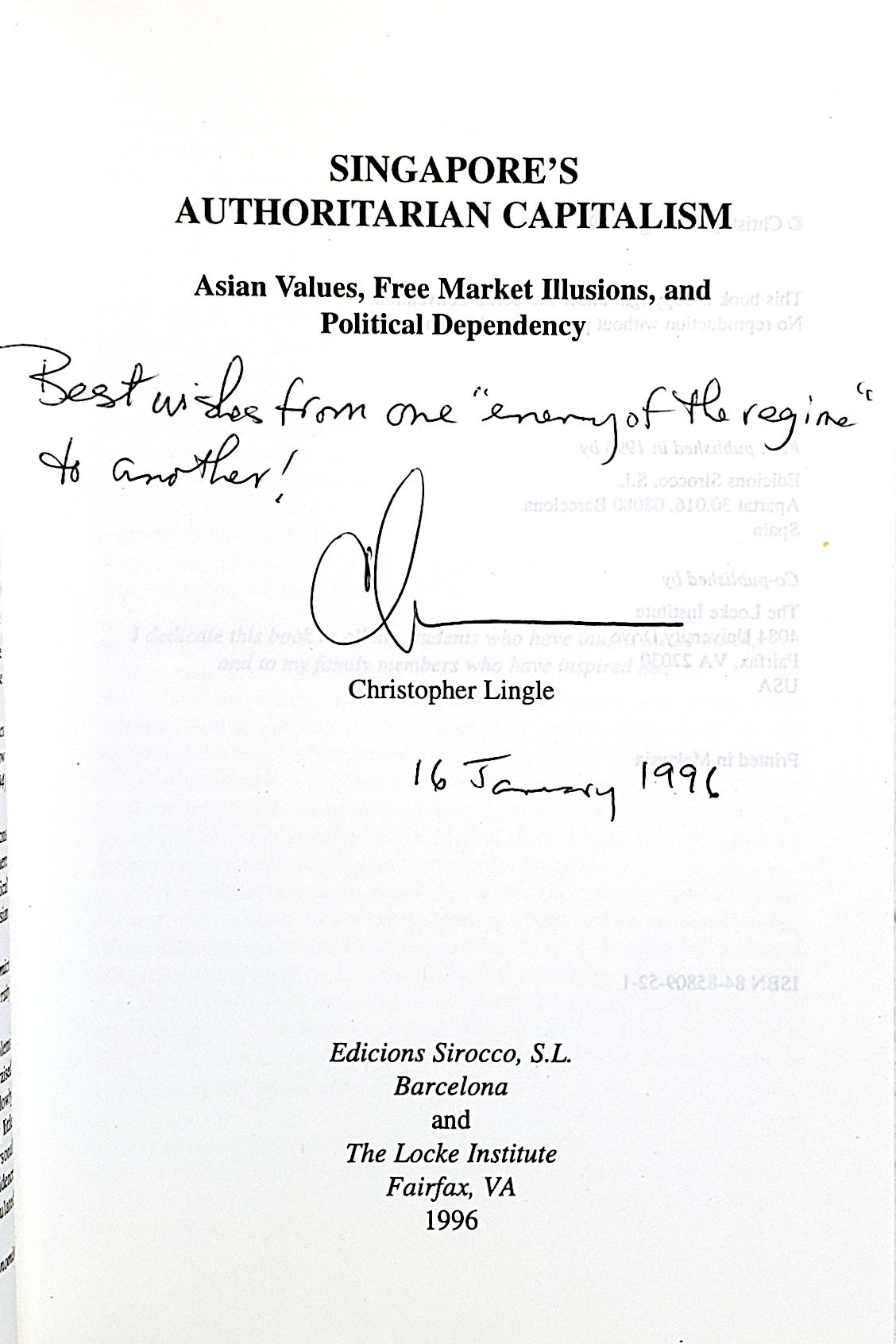 Barcelona / Fairfax: Edicions Sirocco / The Locke Institute, 1996. Very good. Barcelona / Fairfax: Edicions Sirocco / The Locke Institute, 1996. First Edition. Signed by the author to journalist and former Nixon speechwriter William Safire on full title with inscription "Best wishes from one 'enemy of the regime; to another! Christopher Lingle, 16 January 1996." Additional signed post-it on half title with note "Happy New Year (year of the rat!) Note your remark on the back cover. Regards, Christopher Lingle." Safire is quoted on the back cover "The very mention of Christopher Lingle's name turns Harry Lee (Kuan Yew) and his whole compliant judiciary purple with rage."