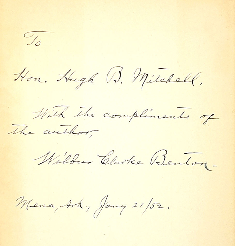 Philadelphia: Dorrance & Company, 1951. Very Good/Fair. Philadelphia: Dorrance & Company, 1951. First Edition. Signed by author on front free endpaper to former U.S. Representative and Senator from Washington Hugh B. Mitchell with inscription, "To Hon. Hugh B. Mitchell, / With compliments of / the author, / Wilbur Clarke Benton. / Mena, Ark., January 21/52."