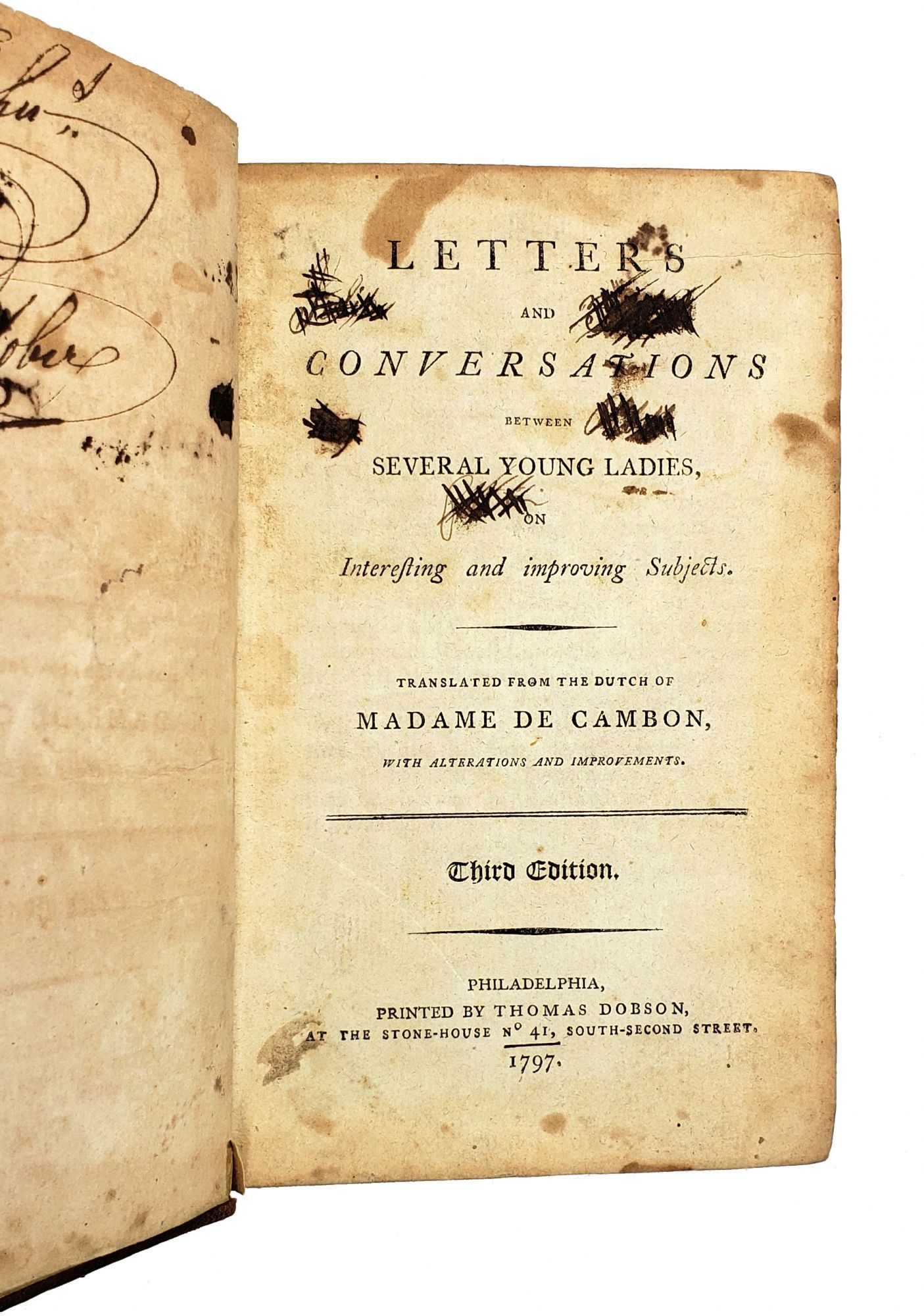 Philadephia: Thomas Dobson, 1797. Third Edition. Very Good. Philadelphia: Thomas Dobson, 1797. Third Edition. Duodecimo. 318 pages plus 2 pages of advertisements. Full contemporary sheep with red spine label. Translated from Dutch. The translator's "Advertisement" claims that this work is an extension of Samuel Richardson's "Clarissa," though the title and names have been altered because, "it has been objected... that it does not coincide with the Work to which the title seems to connect it."