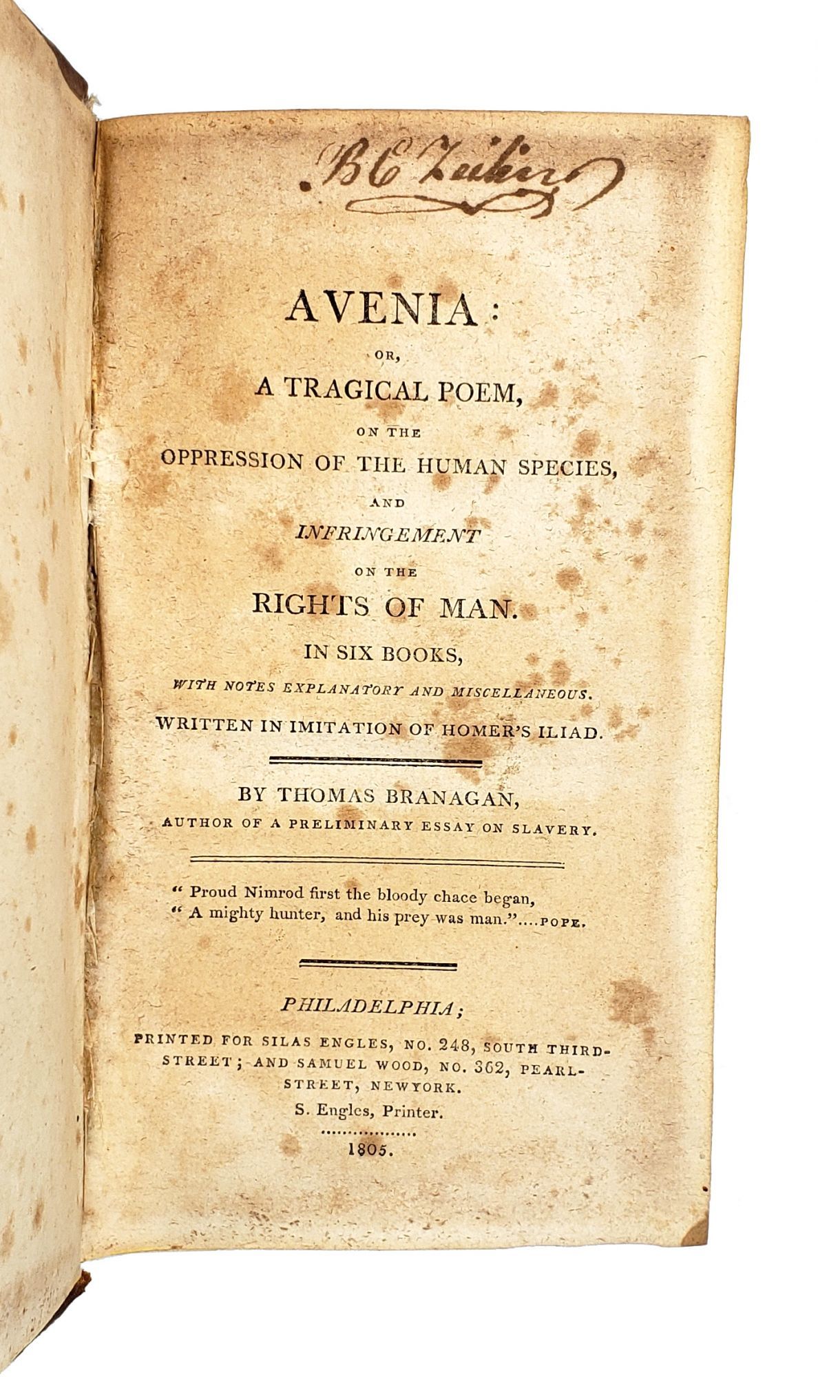 Branagan was born in Dublin, ran away from home to become a sailor, worked on slave ships, and, eventually, became overseer of a slave plantation in Antigua. Branagan converted to Methodism, moved to Philadelphia, and became an ardent abolitionist. He wrote a number of books on the evils of slavery, some in the form of poetry, and Avenia is one of the earliest.