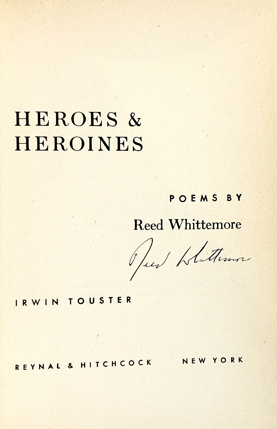 New York: Reynal & Hitchcock, 1946. Very Good/Very Good. New York: Reynal & Hitchcock, 1946. First Edition. Signed by the author without inscription on full title. Octavo (8.25" x 5.75"); x, 80p. Illustrated black dustjacket with original $2.50 price; book in red cloth with blue lettering. Jacket shows a few small chips and tears along edges and some scuffs to face. Boards are sturdy and square with light edgewear. Binding is sound and pages unmarked. First collection by the two-time United States Poet Laureate and co-founding editor of the small and influential literary magazine Furioso.