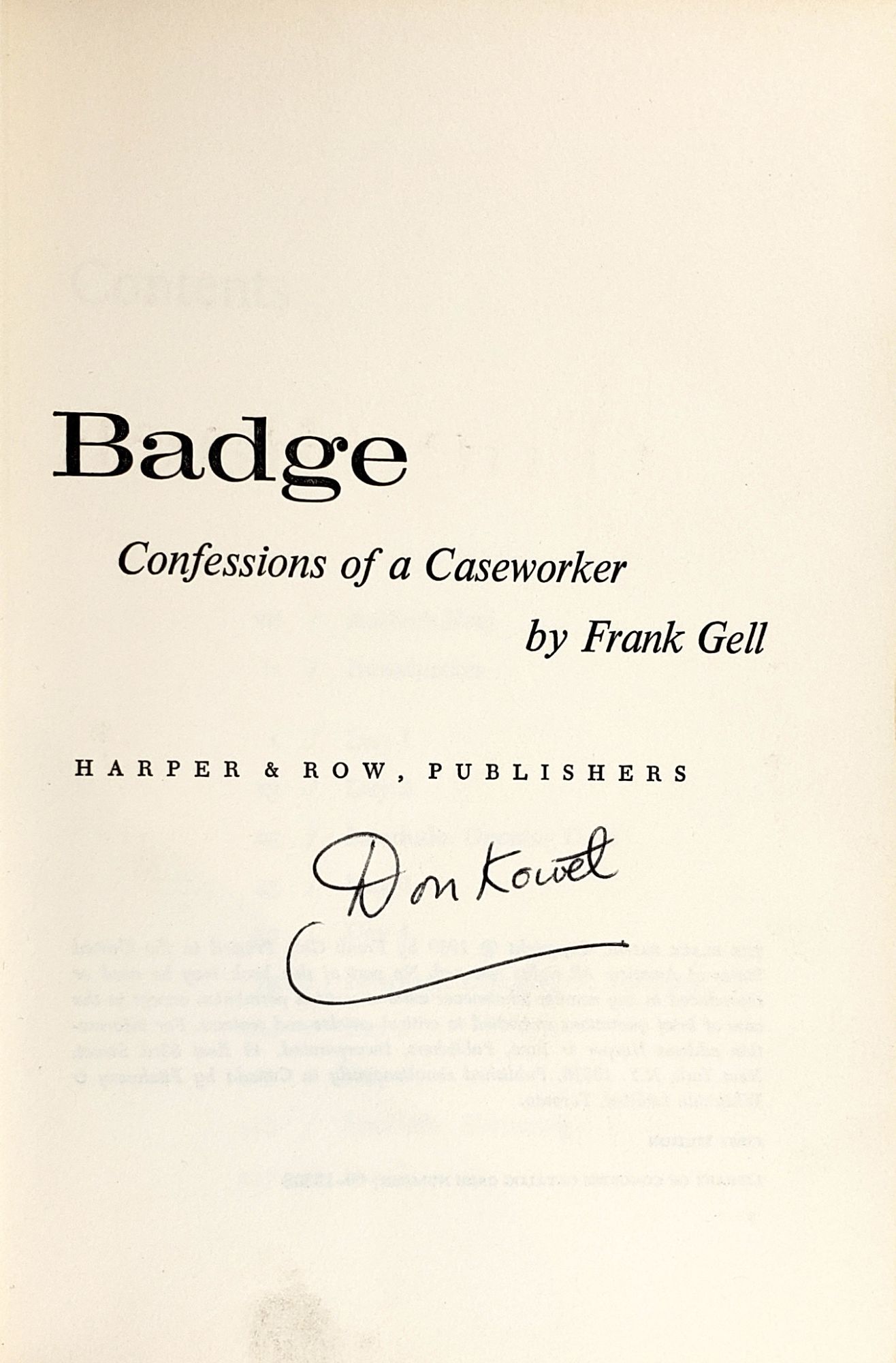 New York: Harper & Row, 1969. First Edition. Hardcover. Very Good/Very Good. New York: Harper & Row, 1969. Stated First Edition. SIGNED by the author without inscription on full title. Octavo (8.5" x 5.75"); xiii, 226p. Original dustjacket with $5.95 price; book in mustard paper-covered boards with black cloth spine and gilt lettering. Jacket shows a few small chips and tears along edges, with a small dampstain along bottom edge visible from interior. Boards bumped at corners and spine ends with some toning and smudging. Small dampstain at bottom of front free endpaper. A few pages with some spotting and smudging, but no marks. Binding is sound. Kowet's account, written under pseudonym, of his two years working as a caseworker in the New York City Department of Public Welfare.