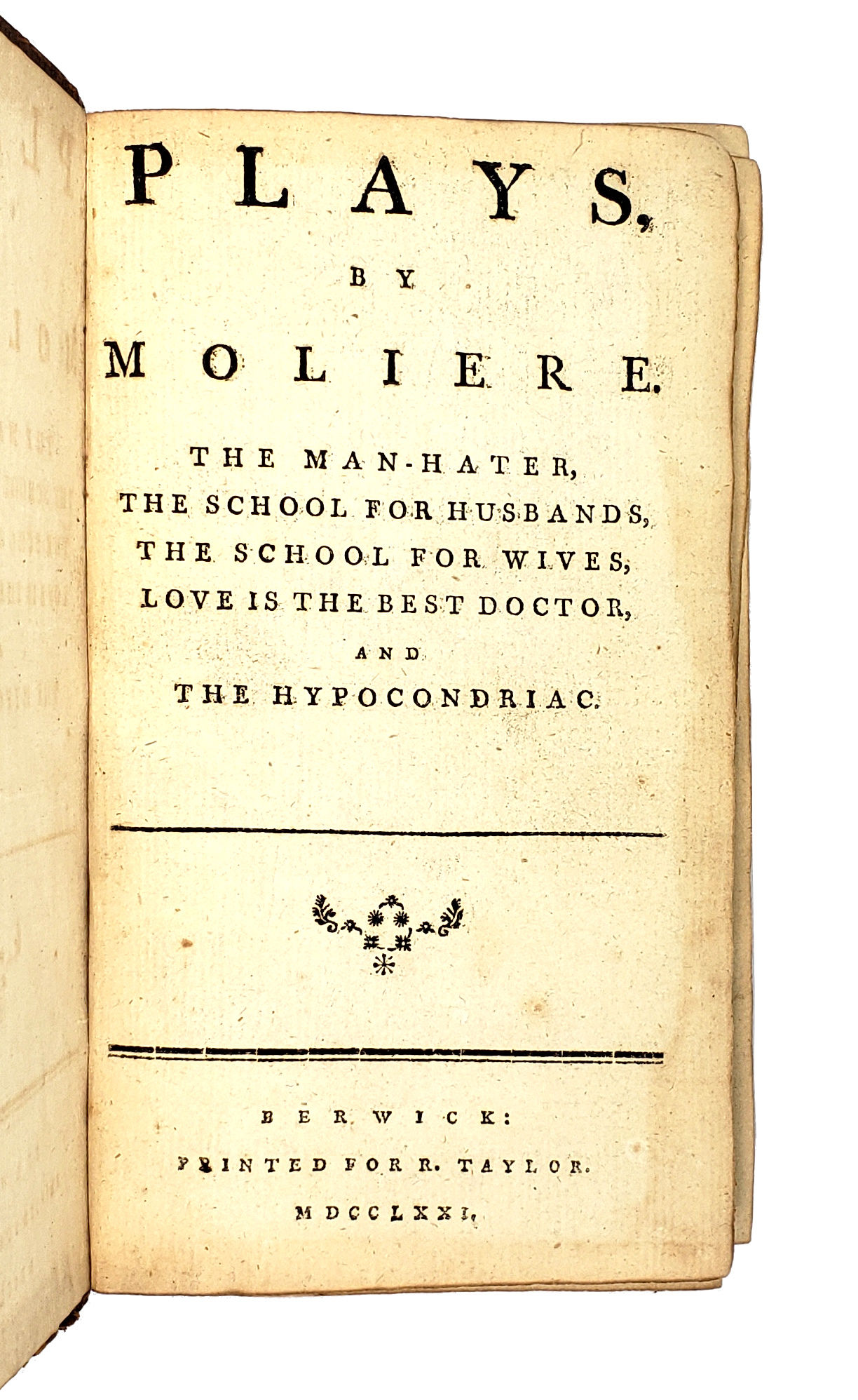 Collection of five plays, independently paginated. The publisher also released a six volume "new translation" of Moliere's works in the same year.