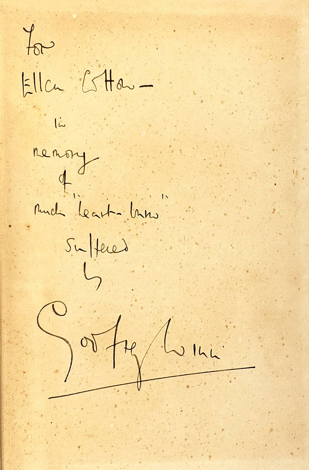 London: Duckworth, 1932. Second Impression. Hardcover. Very Good/No Jacket. London: Duckworth, 1932. Second Impression. SIGNED by the author with brief inscription on front free endpaper. Black cloth-covered boards with gilt lettering to spine. Missing dustjacket. 2.5" slit along back joint at bottom with some nearby fraying. Boards are square with light edgewear and a fair bit of smudging to front and back and fading to spine. Previous owner's address on front pastedown. Initial and terminal pages foxed, clearing up for majority of text. Binding is sound and pages unmarked.