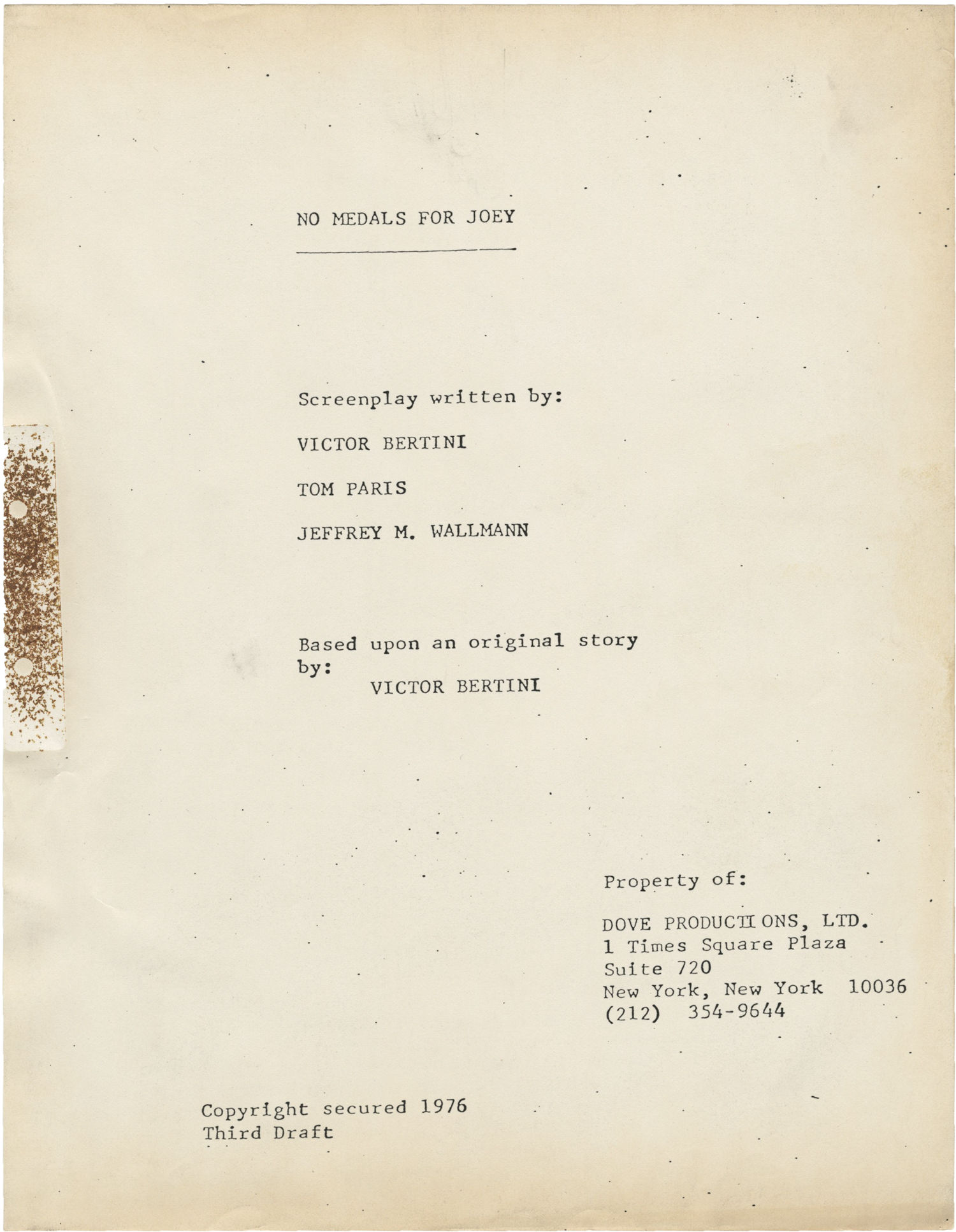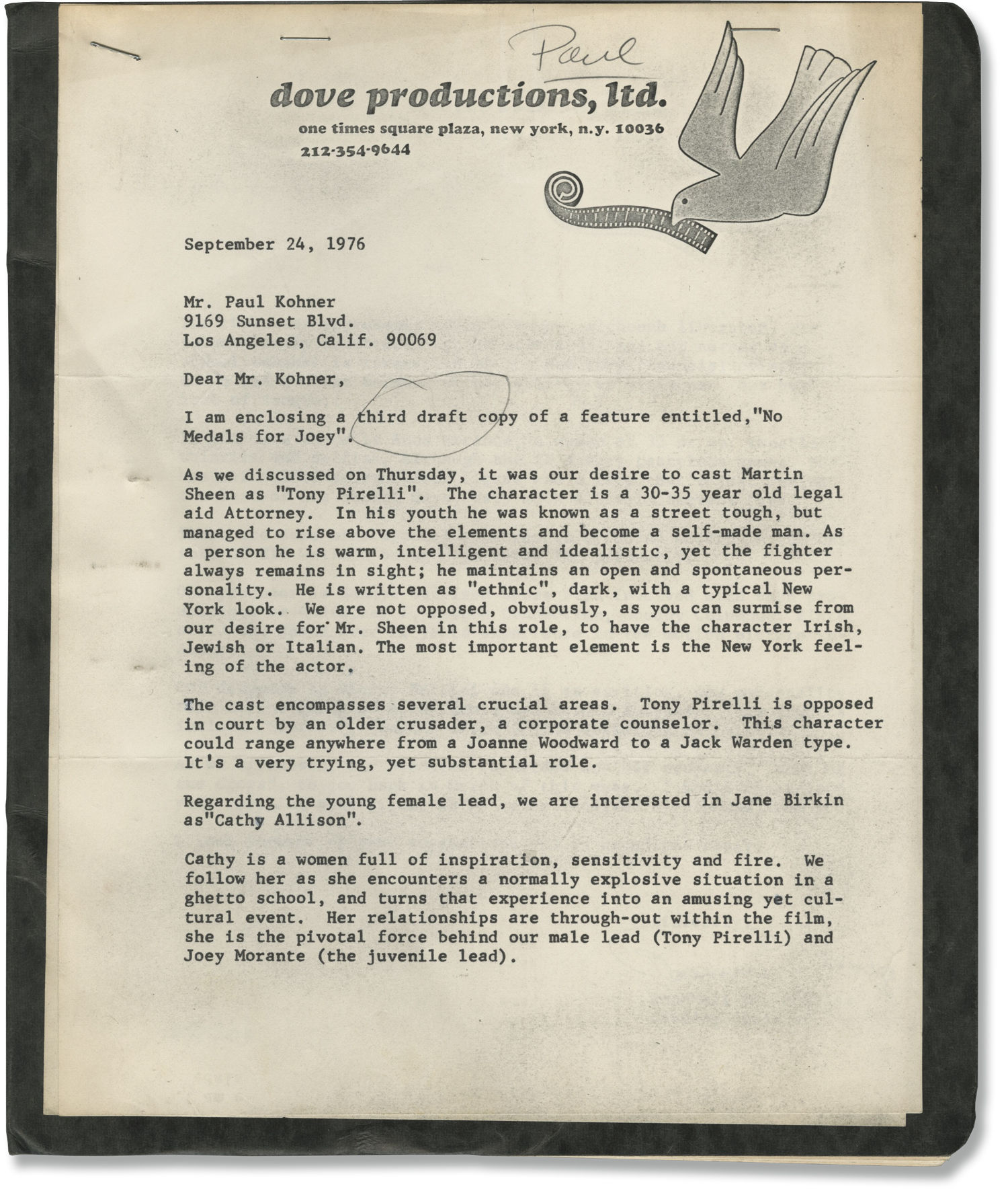 New York: Dove Productions, 1976. Third Draft script for an unproduced film. Laid in is a photocopied letter from casting director RoseMari St. Charles to Paul Kohner, dated September 24, 1976. The memo makes mention of several possibilities for casting the film, including Charlie Sheen and Joanne Woodward.