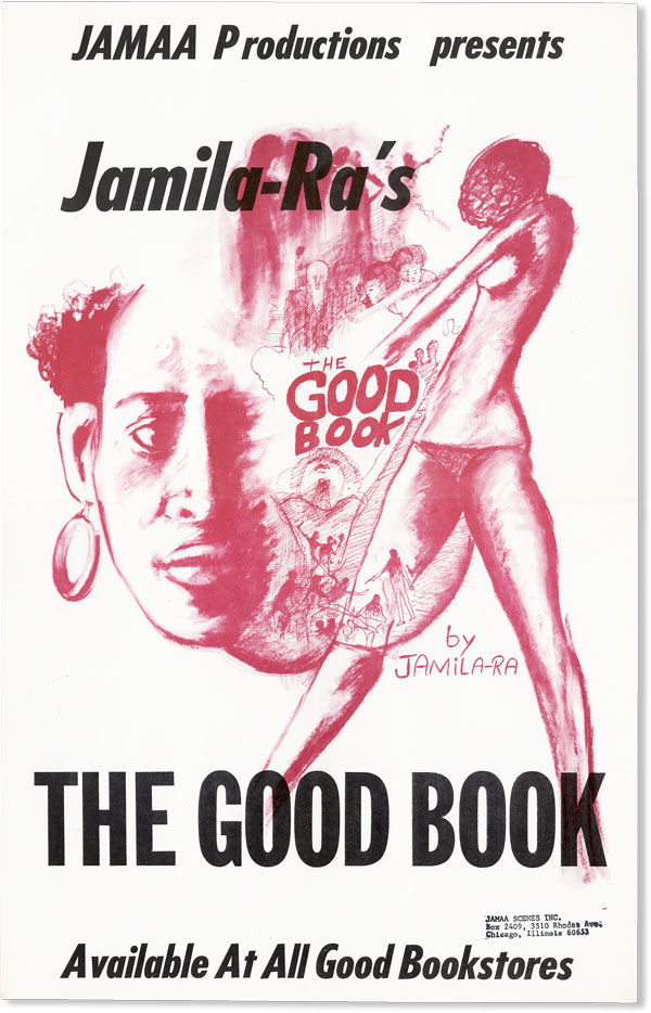 Chicago: Jamaa Scenes Inc, 1971. First Edition. Original illustrated poster, offset printed in two colors on white stock, measuring 35.5cm x 56cm (14" x 22"); two old folds, else Near Fine. Promotional poster for Jamila-Ra's The Good Book, a volume of black revolutionary poems by the Chicago-born poet and member of the Nommo group. OCLC notes 2 holdings (Yale, U.Delaware).