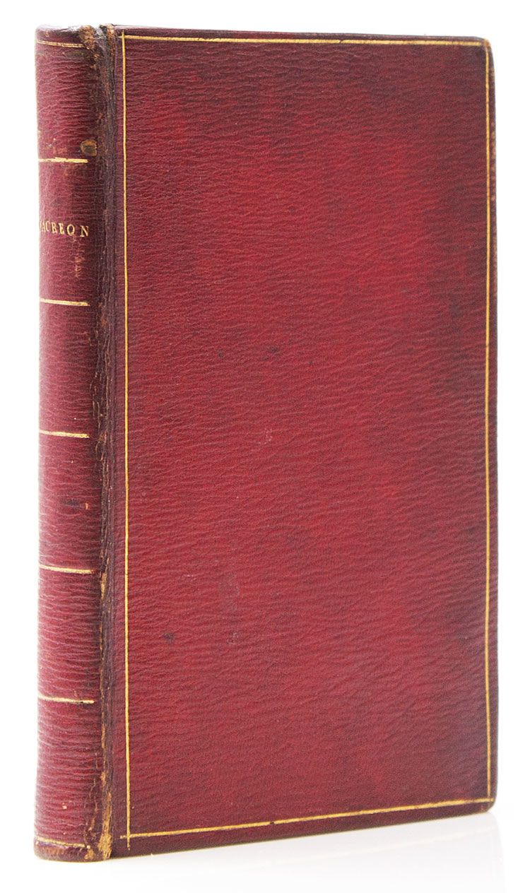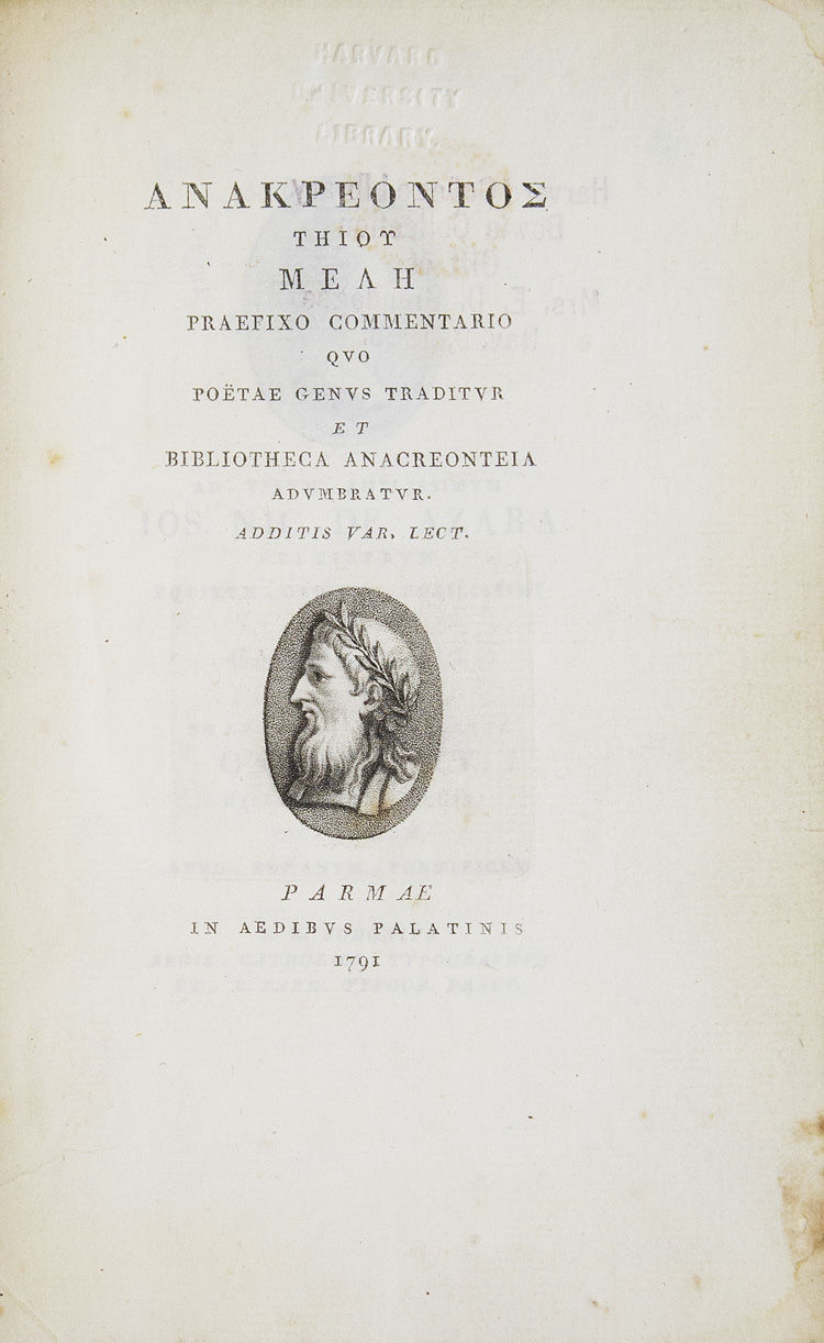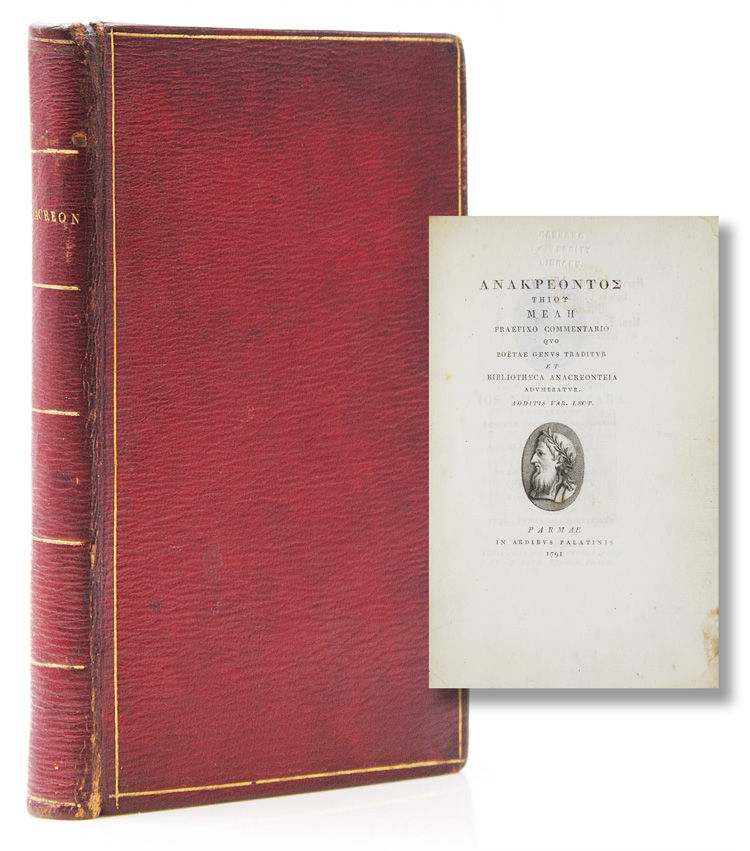 Parma: Bodoni, 1791. One of 150 copies. Engraved portrait vignette on title and head of text. [iv], cxviii, [2], 111 pp. 12mo. Contemporary full straight-grained red morocco, gilt ruled border and spine, gilt title. Light shelfwear, front flyleaf starting. Ex-Harvard University Library (blindstamp on title on one other leaf, donor's ink stamp on verso of title, bookplates with deaccession stamp), 2 other bookplates and book ticket with bibliographical citations (Brunet and Dibdin). One of 150 copies. Engraved portrait vignette on title and head of text. [iv], cxviii, [2], 111 pp. 12mo. One of two Bodoni editions of Anacreon published in 1791. "The [Bodoni Anacreon] editions of 1785 and 1791 are printed in capital letters, and more elegant and exquisitely finished productions cannot be conceived" (Dibdin_. Brooks 422; Brunet I, 252