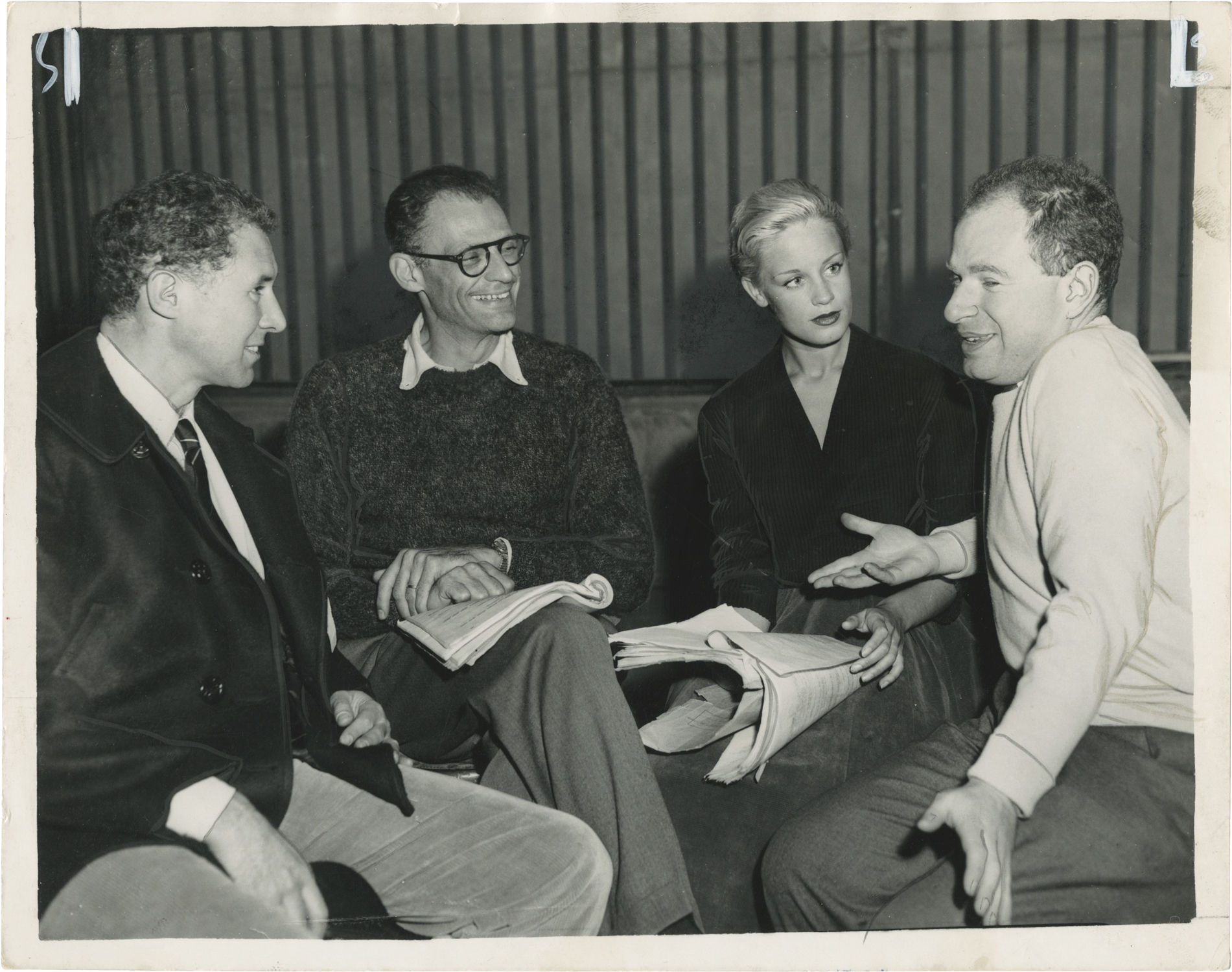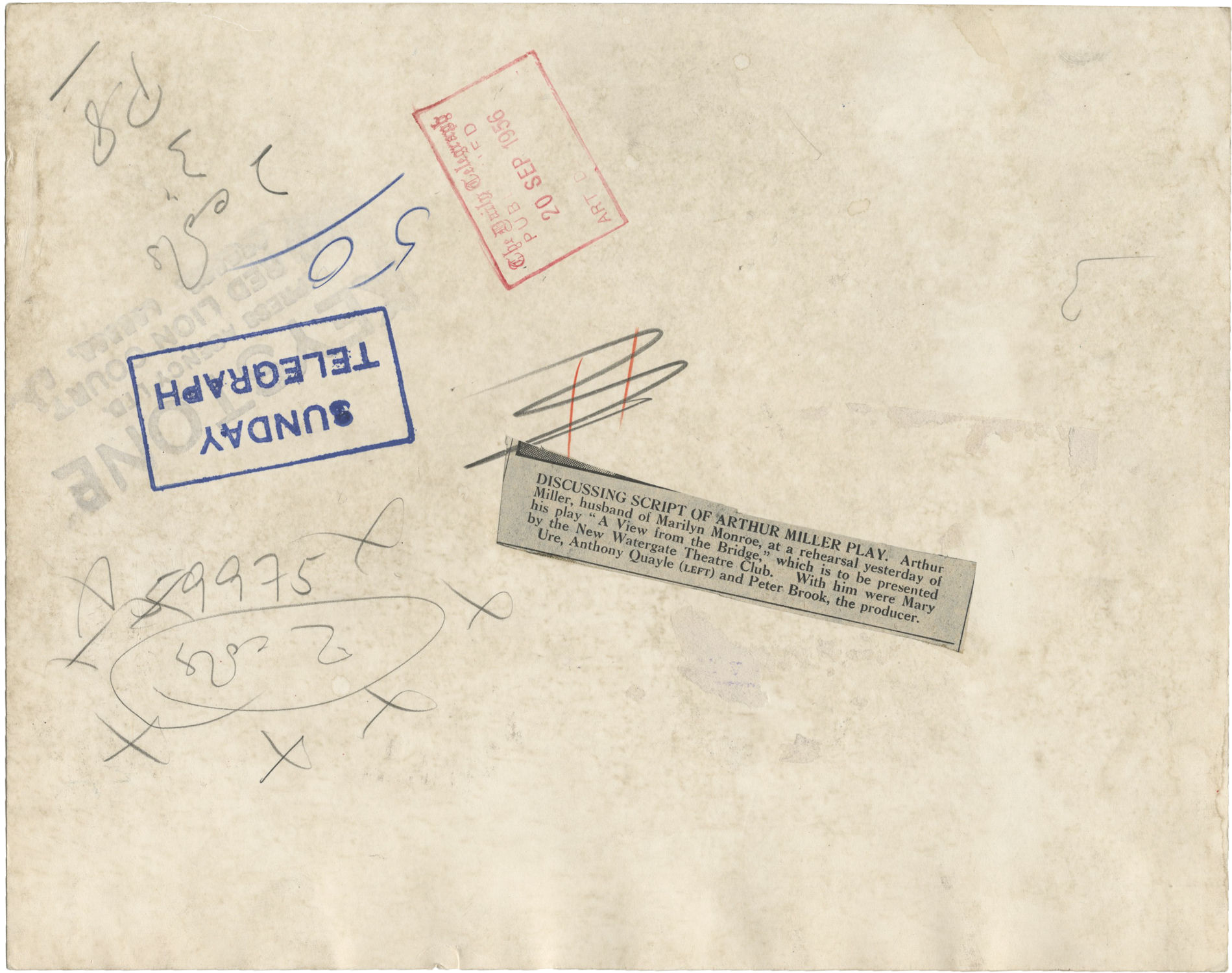 N.p.: N.p., 1956. Vintage photograph from a rehearsal for the 1956 London premiere with playwright Arthur Miller, theater director Peter Brook, and actors Anthony Quayle and Mary Ure. Snipe and "Sunday Telegraph," "The Daily Telegraph" and "Keystone Press Agency Ltd" stamps on the verso.