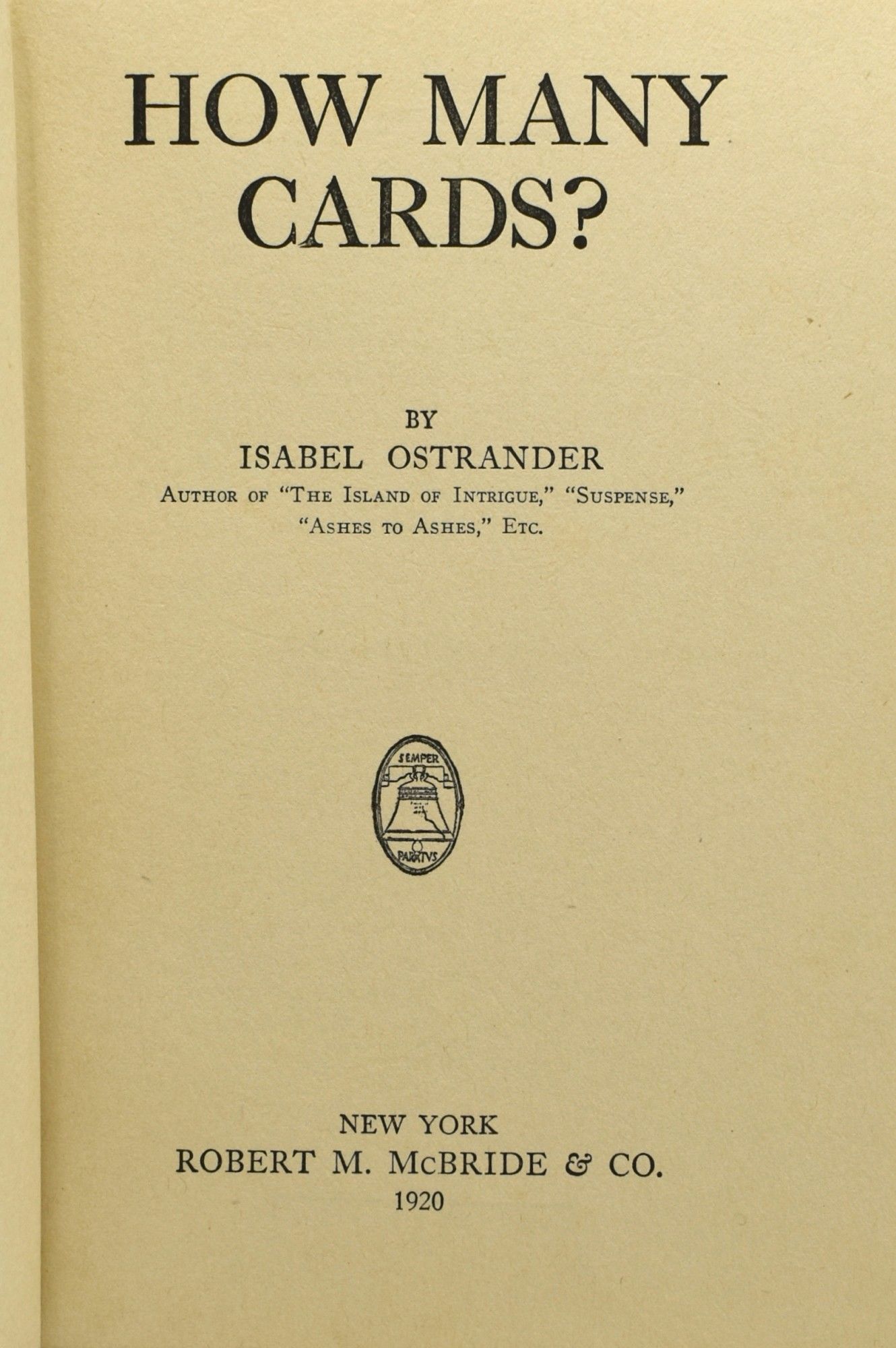 New York: Robert M. McBride & Co, 1920. First Edition. Hard Cover. Very Good binding/Very Good dust jacket. First Edition of a mystery by Isabel Egenton Ostrander, featuring her popular character, Timothy McCarty. Minor toning to the endpapers only. Some silverfishing and spots of soiling to the dustjacket, which is not priceclipped. Binding somewhat cocked. Dark green cloth with black lettering. Overall in Very Good condition with Very Good dustjacket. (Hubin ). Very Good binding / Very Good dust jacket.