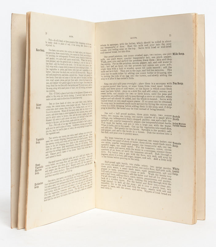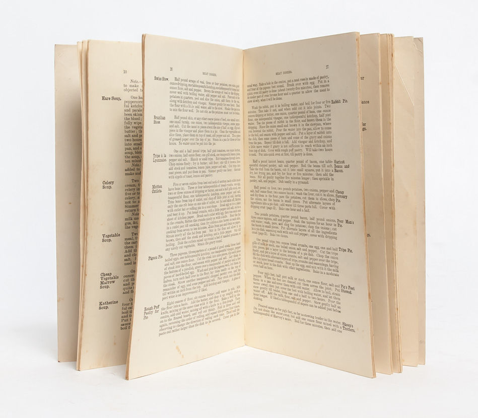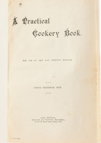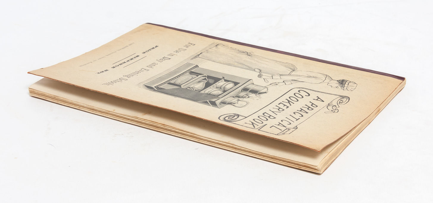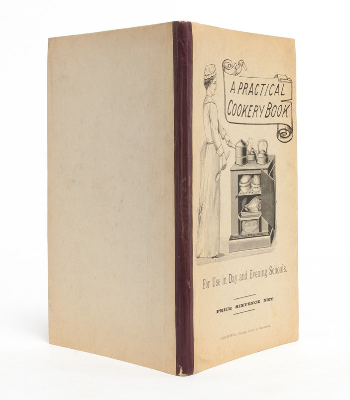 "Around the year 1900 there was a concern about the physical state of the people of Britain. Even though there had been tremendous efforts in the late 19th century to provide better public health, housing, and education, many children were still no more healthy than they had been back in the 1840s. The new Liberal government elected in 1906 passed various measures to try to deal with this problem....and they gave permission for schools to offer meals to their pupils" (National Archives). Efforts to consider the link between education and nutrition had begun in the lead-up to the laws, however; and the present work is a scarce surviving example of such a cookery. Its compilers note in the preface "This collection of Recipes has been prepared specially for Day and Evening Schools. The instructions of the Education Department...have been embodied." Given the book's brevity, it contains a multitude of basic, nutritious and locally accessible foods that can be combined for a variety of different meals -- always with an eye to giving growing students the fuel they need to grow and thrive in their schooldays. There is even included a selection of recipes designed for the sickroom, when students are ill and need extra care for their health. A research-rich compendium. Near Fine.