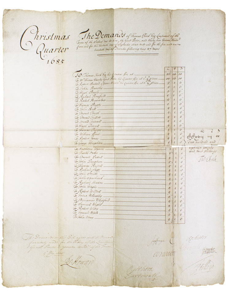 Document signed. Christmas Quarter The Demands of Thomas Check Esq . Lieutenant of the Tower of the salary due to him, the Gent Porter and thirty-two Yeomen … from the thirtieth day of September 1685 unto and for the five and twentieth day of December following being 87 days. Signed by Check and others