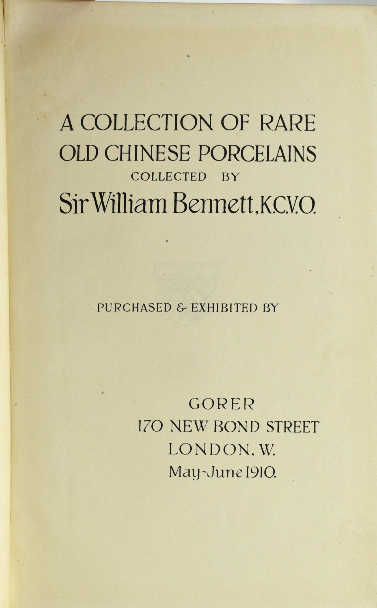 London: Gorer, 1910. Hard Cover. Very Good binding. An exhibition catalog for the Bennett collection of Chinese porcelains. With color photographic plates throughout, and tissue guards. Scattered foxing. Green cloth with gilt lettering. Very Good binding.