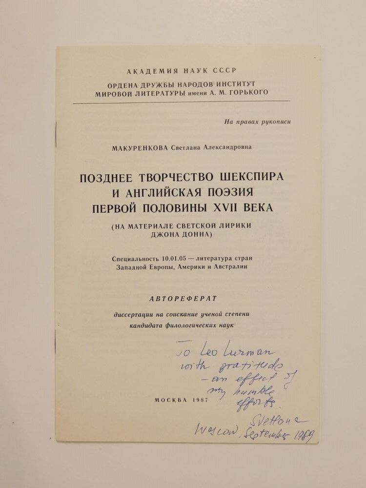 Moscow, 1989. paperback. very good. Signed program from an event about human rights to American writer and editor Leo Lerman (best known for his work at Conde Nast publications and as a major advocate for gay rights from the 1940's until his death in 2011), inscribed: "To Leo Lerman - with gratitude - an effect of my humble efforts - Svetlana - Moscow - September 1989". Excellent condition.