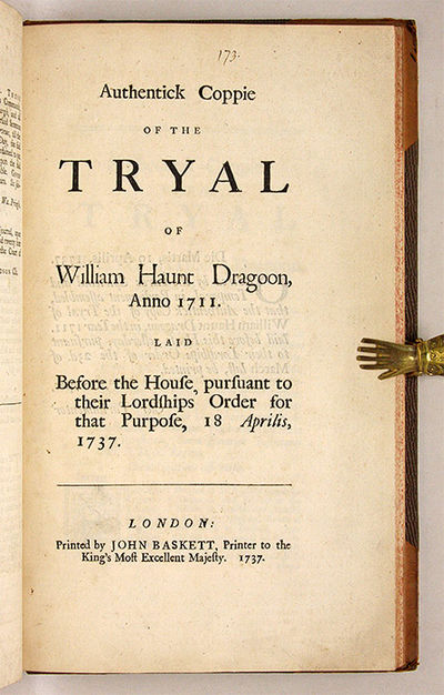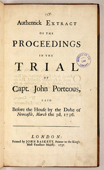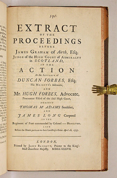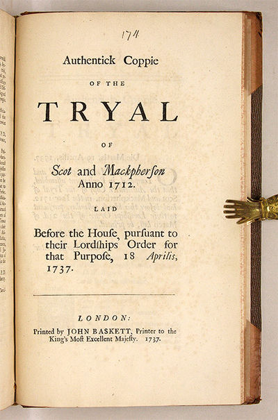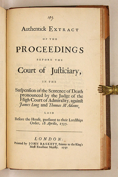 1737. 5 pamphlets bound in 1 book. 5 pamphlets bound in 1 book. Interesting English Cases Tried in 1737, Three Concerning Soldiers, One a Cattle Thief [Trials]. [Great Britain]. [Three Cases Concerning Soldiers, One Concerning a Cattle Thief]. London: Printed by John Baskett, 1737. Folio (12-1/2" x 7-3/4"). Five pamphlets, two relating to the same trial, bound into nineteenth-century three-quarter calf over pebbled cloth, tiny blank label to foot of front board, raised bands and lettering pieces to spine. Light rubbing to boards, moderate rubbing to extremities, corners bumped, sections of backstrip lacking from spine ends, front board detached, rear board partially detached. Light toning to text, light foxing in places, light soiling to title pages, each with a number in an early hand, the first with a small later library stamp. $950. * Only editions. The cases of Porteous, Haunt and McAdams and Long involve murders committed by members of the army. Laidly's case involved cattle theft and assault. Contents: 1. Porteous, John, Defendant. Authentick Extract of the Proceedings in the Trial of Capt. John Porteous, Laid Before the House by the Duke of Newcastle, March the 3d, 1736. [ii], 68 pp. English Short-Title Catalogue (ESTC) T22797. 2. Haunt William, Defendant. Authentick Coppie of the Tryal of William Haunt, Dragoon, Anno 1711. Laid Before the House, Pursuant to Their Lordships Order for that Purpose, 18 Aprilis, 1737. 28 pp. ESTC T22794. 3. McAdams, Thomas, Defendant. Long, James, Defendant. Extract of the Proceedings Before James Graham of Airth, Esq; Judge of the High Court of Admiralty in Scotland, In the Action at the Instance of Duncan Forbes, Esq; His Majesty's Advocate, And Mr. Hugh Forbes, Advocate, Procurator Fiscal of the Said High Court, Against Thomas Mc Adams Souldier, And James Long Corporal in the Regiment of Foot Commanded by Colonel _____ Hamilton. Laid Before the House Pursuant to Their Lordship's Order April 18, 1737. 47, [1] pp. ESTC T33912. 4. Long, James, Defendant. McAdams, Thomas, Defendant. Authentick Extract of the Proceedings Before the Court of Justiciary, In the Suspension of the Sentence of Death Pronounced by the Judge of the High Court of Admirality [sic], Against James Long and Thomas McAdams, Laid Before the House, Pursuant to Their Lordships Order, 18 Aprilis,