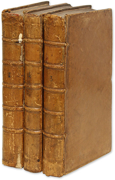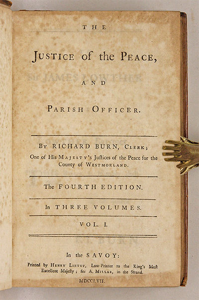1757. 3 vols. 4th ed, London, 1757. 3 vols. 4th ed, London, 1757. Early Edition of Burn's Justice Burn, Richard [1709-1785]. The Justice of the Peace, And Parish Officer. [London]: Printed by Henry Lintot, 1757. Three volumes. xxiv, 520; 432; 512 pp. Complete set. Octavo (8-1/4" x 5"). Contemporary calf, blind rules to boards, blind fillets along joints, raised bands and black-stamped volume numbers to spines, blind tooling to board edges, lettering pieces lacking. Light rubbing and a few minor scuffs and nicks to boards, moderate rubbing to extremities with wear to spine ends, corners bumped, boards partially detached but secure, spot of paint to spine of Volume I. Moderate toning, light foxing to most of interiors, early annotations to front free endpaper of Volume II, early owner signature (of Sam Foster) to title pages of Volumes II and III, (illegible) early owner initials (or cipher) to front free endpaper of Volume I. $500. * Fourth edition. A remarkably durable work, Burn's Justice was first published in 1755. It went through 30 editions by 1869 and was excerpted often in early American justice manuals, such as Parker's Conductor Generalis (1764) and Burn's Abridgment of Burn's Justice of the Peace and Parish Officer (1773). It covers such topics as Accessory, Alehouses, Aliens, Assault and Battery, Bail (By Writ of Habeas Corpus), Bankrupt, Banks for Savings (Rules and Regulations), Burglary, Clergy, Dogs, Evidence, Excise and Customs, Fish and Fisheries, Forfeiture, Forgery, Game, Homicide, Indictment, Jurors, Libel, Oaths, Insolvent Debtors, Polygamy, Poor Law, Promissory Notes, Rape, Riot, Robbery, Taxes, Vagrants and much more. Holdsworth notes that "a perusal of these headings tells us something of the development of the system of local government" during the time of the book's publication. Holdsworth, A History of English Law X:162. English Short-Title Catalogue T68905.