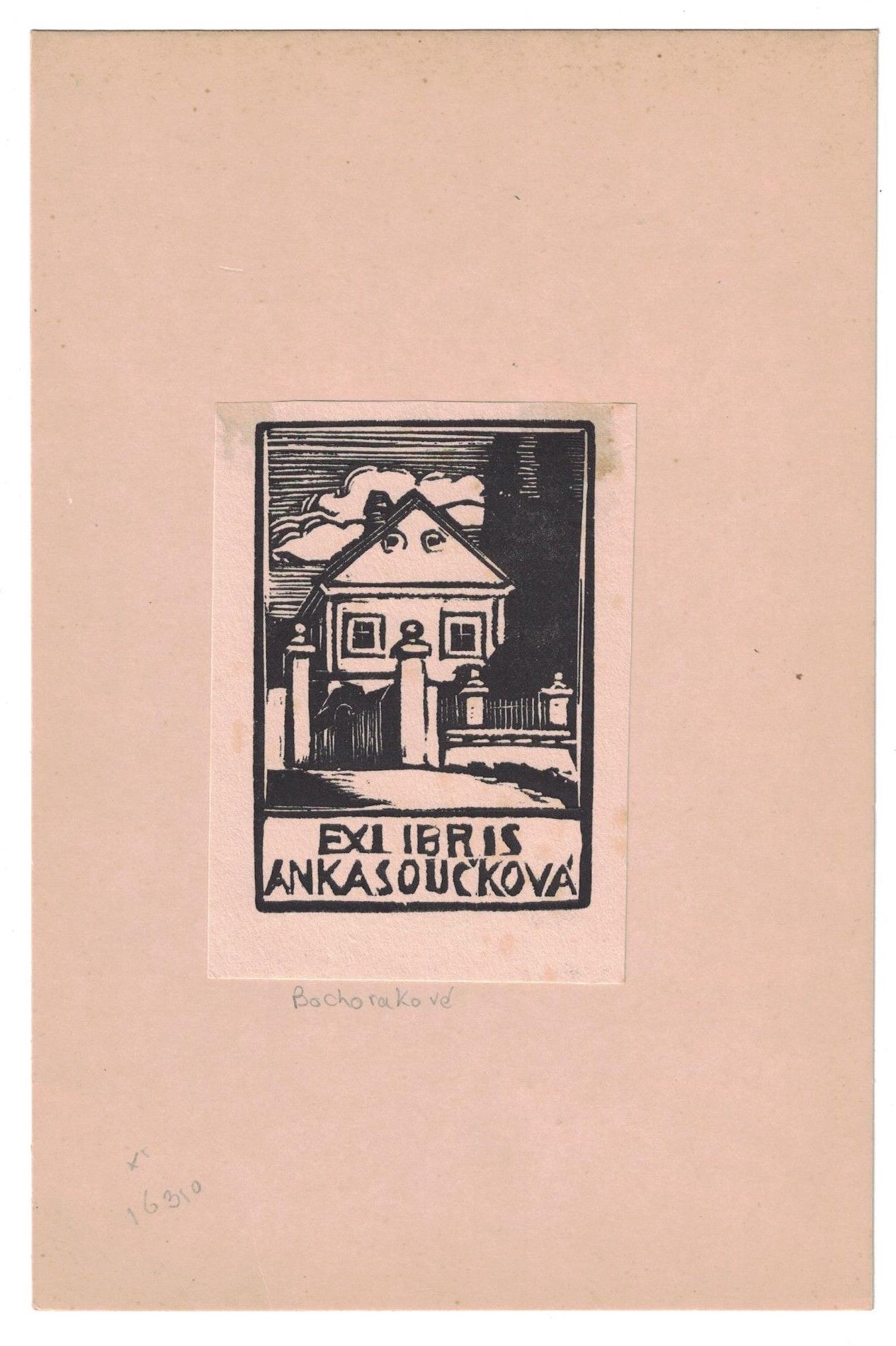 Very good. Reproduction of bookplate of Anka Souckova, created for the portfolio "Ex Libris: 15 Medirytin a Drevoryt ," a collection of bookplates created by Bochorakova-Dittrichova. Woodcut measuring 6cm x 9cm, featuring an image of a gated residence. Pasted to cardstock at top edge, light foxing, else very light wear. Helena Bochorakova-Dittrichova (1894-1980) was the first female wordless novelist and the only woman to work in this medium during its heyday. She was born in the Moravian region of what is now the Czech Republic and spent most of her life in Brno, the Moravian capital. She graduated from the Academy of Fine Arts in Prague and in 1923 received a government scholarship to study printmaking in Paris. Bochorakova-Dittrichova's unpublished wordless novel Malirka Na Cestach [The Artist on Her Journey] recounts this period in her life. In Paris, she first encountered the wordless novels of Flemish artist Frans Masereel, the originator of the form, and was inspired to create her own. Over the course of her long career, Bochorakova-Dittrichova published several wordless novels, along with travelogues and historical works. She also worked as a printmaker and illustrator, and was highly regarded in her native land, though largely unknown elsewhere. This changed in 2014, when the National Museum of Women in the Arts held an exhibition of her work entitled "The First Woman Graphic Novelist: Helena Bochorakova-Dittrichova," and this important artist finally began to gain global recognition. Her work, however, is still not widely available.