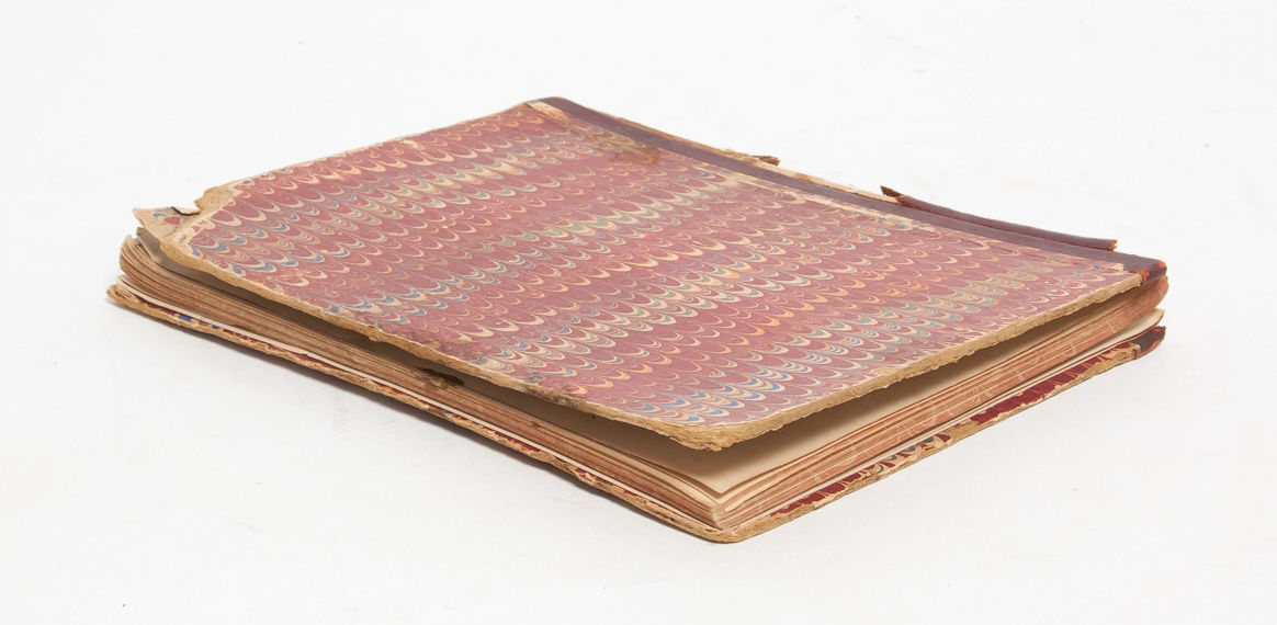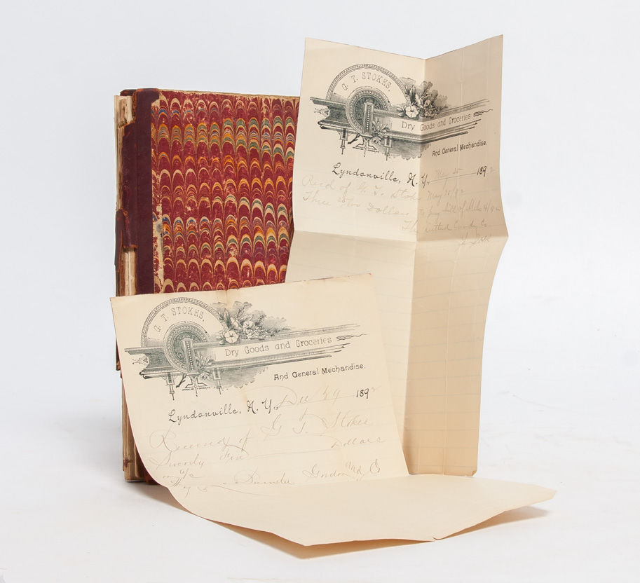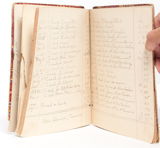 Bangor, NY, 1909. Manuscript ledger containing seventeen years of financial information for the women's philanthropic group. Comprised of 77 handwritten pages with 2 sheets (4 pages) inserted at front. Bound in quarter cloth over marbled card measuring 6 x 7 inches. Cloth spine has largely perished; text block almost fully disbound but held together by remnants. Boards generally rubbed with loss of bottom front corner. Internally, legible and detailed, in a variety of hands.