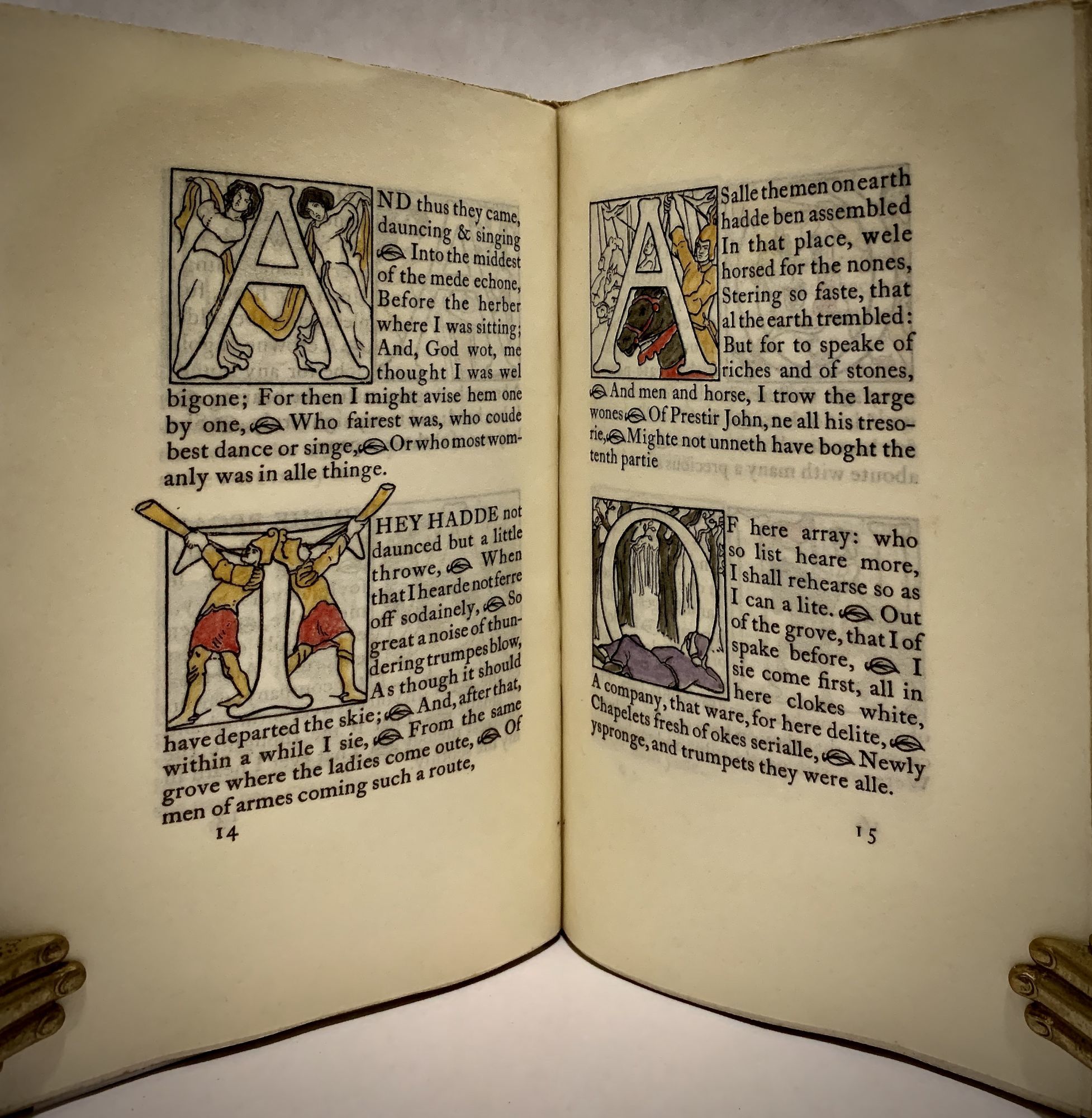 London: Essex House Press (Edward Arnold), 1902. leather_bound. Full limp vellum. Very good. 45 pages. 18 x 12 cm. Limited edition, copy 94 of 165 printed on vellum with front cover Arts & Crafts rose in blind, and entitled "Soul Is Form." Hand colored woodcut frontispiece, plus a central two panel plate, and elaborate colored initials throughout by Edith Harwood. Bookplate of Henry Walters Morrieson front cover pastedown. "The Essex House Press was then an Arts & Crafts press par excellence.....it reveals more of Art Nouveau in many of the books than one would have expected from so devoted a follower of Morris." CAVE: PRIVATE PRESS, p.125 noting Ashbee's work at Essex House. Slight cover soiling at top edges.