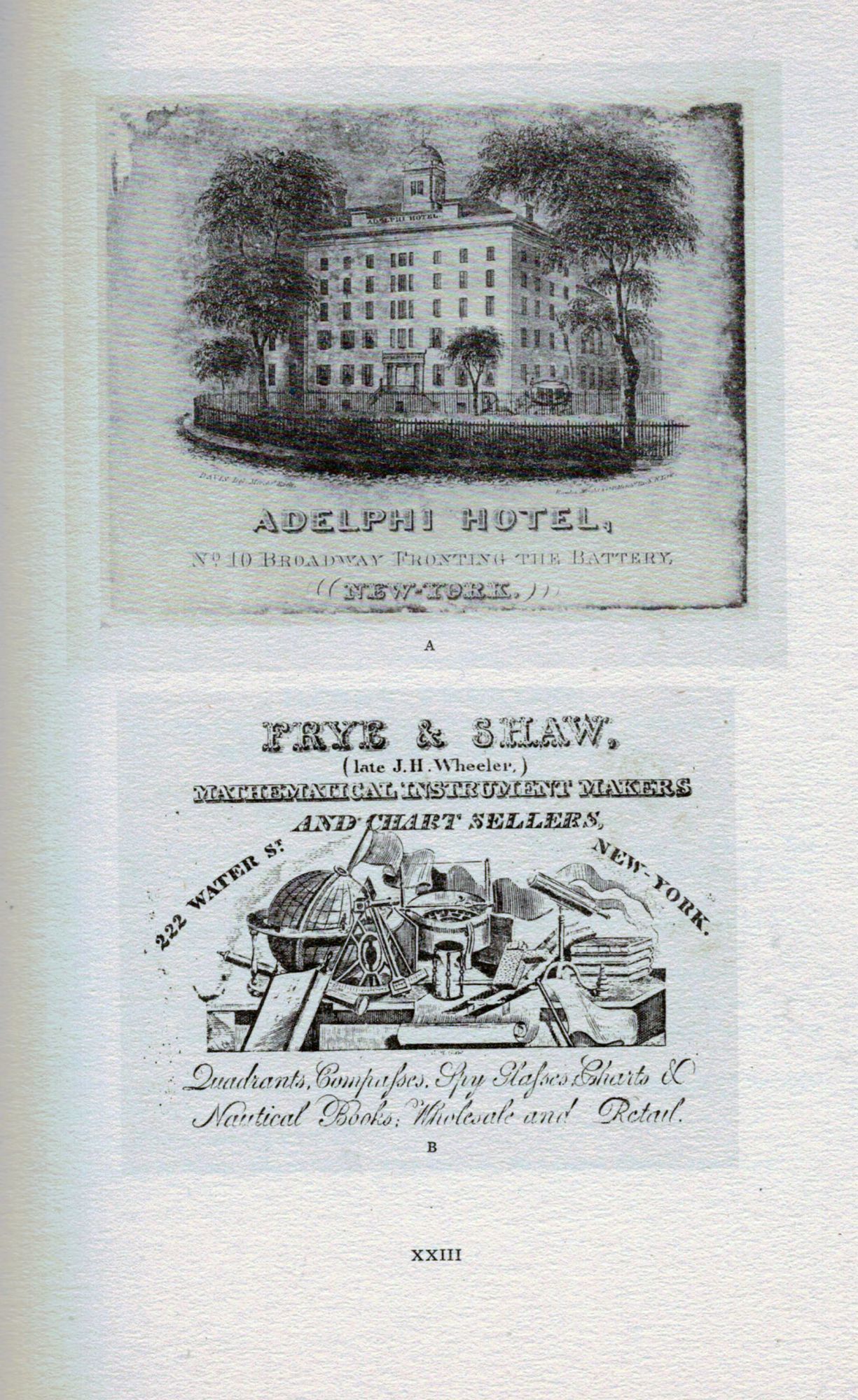 New York: William Edwin Rudge, 1927. First edition. Hardcover. Orig. tan cloth basket weave cloth. Fine in nicked plain dust wrapper. 25 pages in text. 28.5 x 22 cm. Critical Notes by Adele Jenny. Forty-four plates. Double-page fold-out frontispiece in color, a lithograph of a sperm whale. Descriptive Catalogue of the Plates. The earliest trade cards here date from 1730, or thereabouts, as six decades earlier the Crown forbade printing presses in New York. Limited edition, one of 500 copies on rag paper.