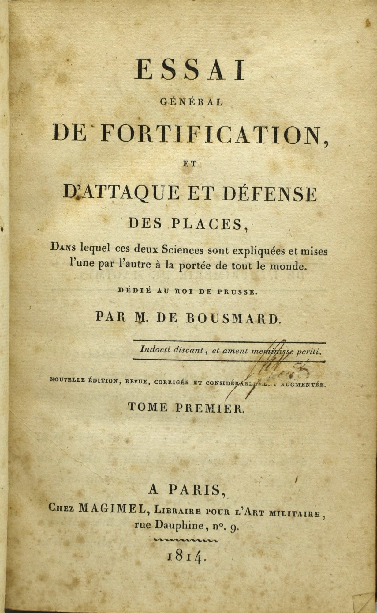 Paris: Chez Magimel, Libraire pour l'Art Militaire, 1814. Early Edition. Half Leather. Very Good binding. Volumes 1, 3 and 4 only of a five volume set. First published in 1797, this being a corrected early edition. A French manual on bastioned fortifications, both addressing the defense and attack thereof. Described by sir Henry Yule's Fortification for Officers of the Army as "probably the best existing view of the whole subject [of military fortifications], as its clear and lively style renders it also one of the most readable books in the engineer's library." Bousmard fell as a Prussian Officer during the defense of Danzig in 1807, but his views on fortifications were followed by many prominent military engineers of the time. Usual, minor foxing and toning throughout, with slight dusty odor. Scuffing and wear to the leather binding. Half calf over marbled paper, with leather labels and gilt decorations. (Henry Yule Fortification for Officers of the Army and Students of Military History pp. 182-183 accessed 11/19/19). Very Good binding.